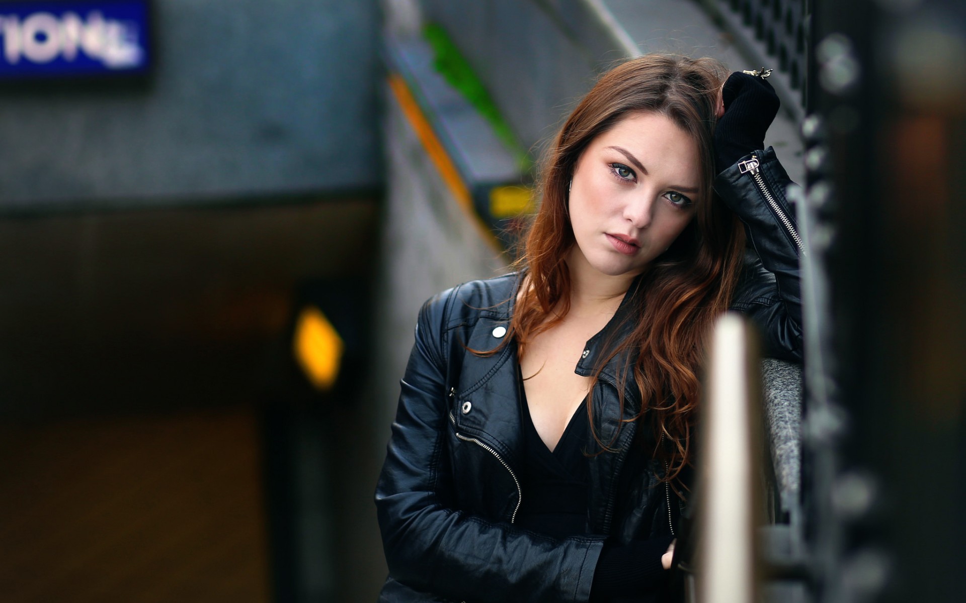 Description: A woman in a black jacket leaning against a wall with her hand on her head and looking at the camera.
