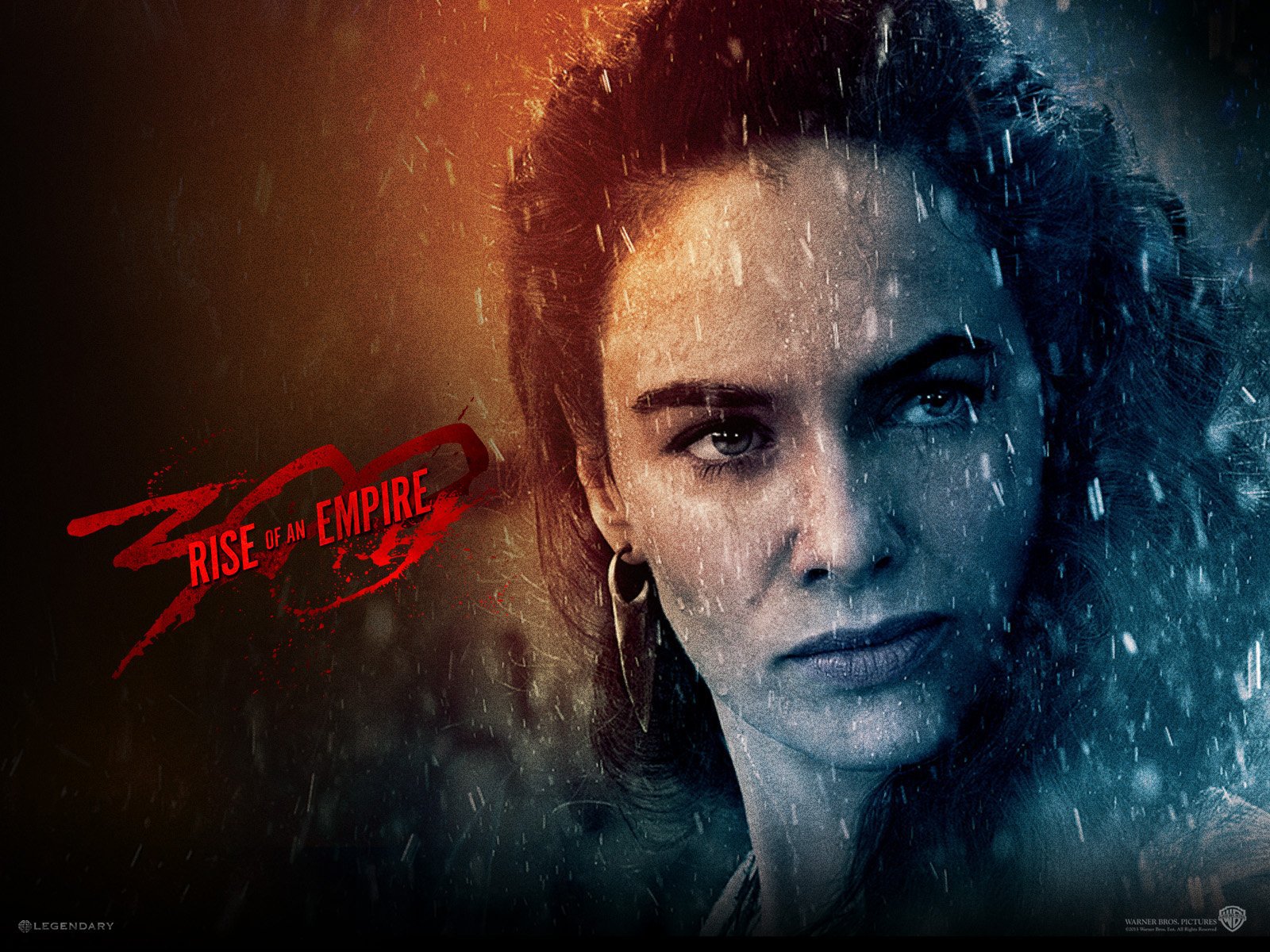 Description: A woman with a black top and a red and black background with the words 300 rise of an empire.