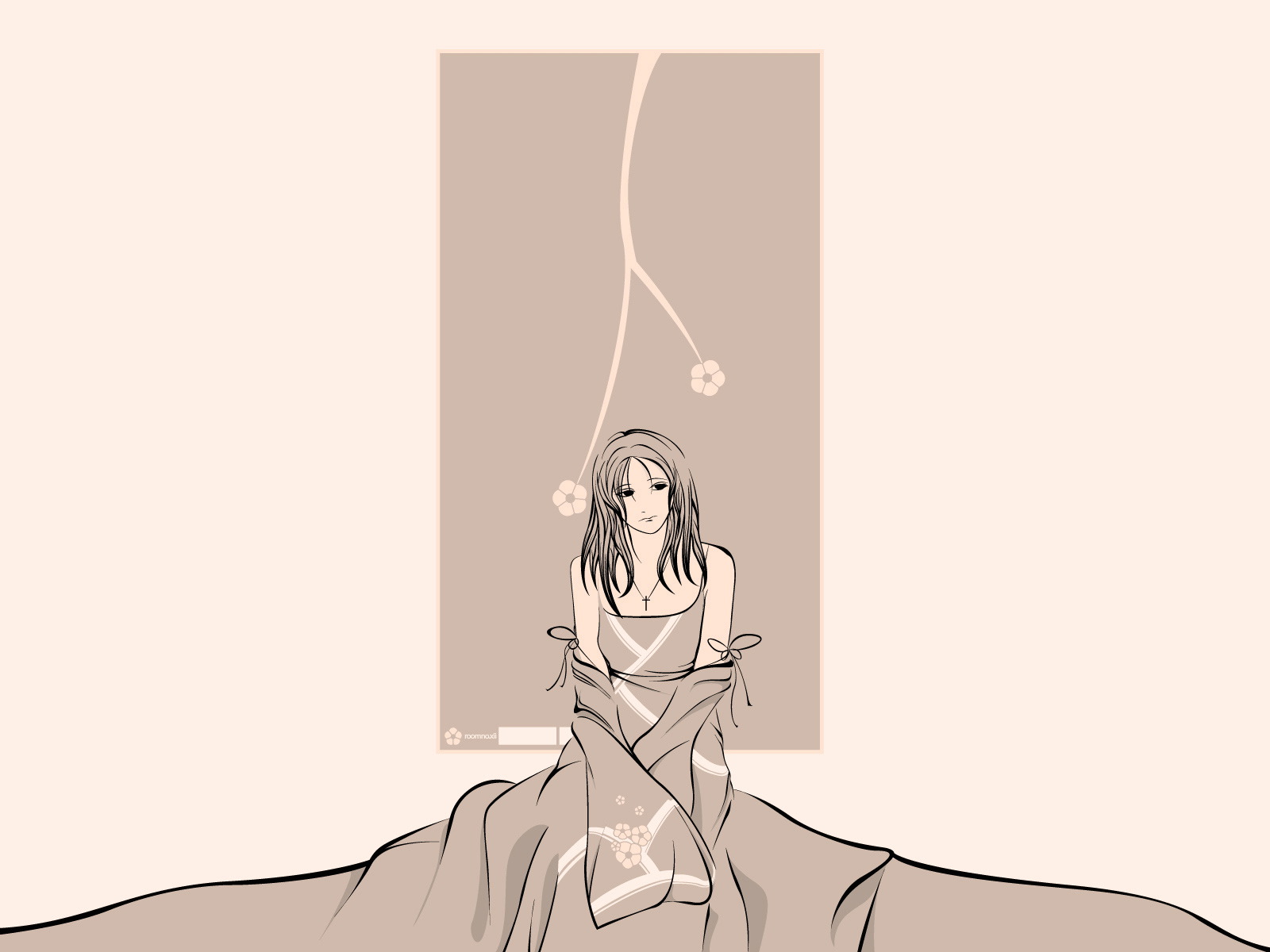 Description: A woman wrapped in a blanket sitting on a bed with a flowered wall in the background and a picture of a flowered wall.