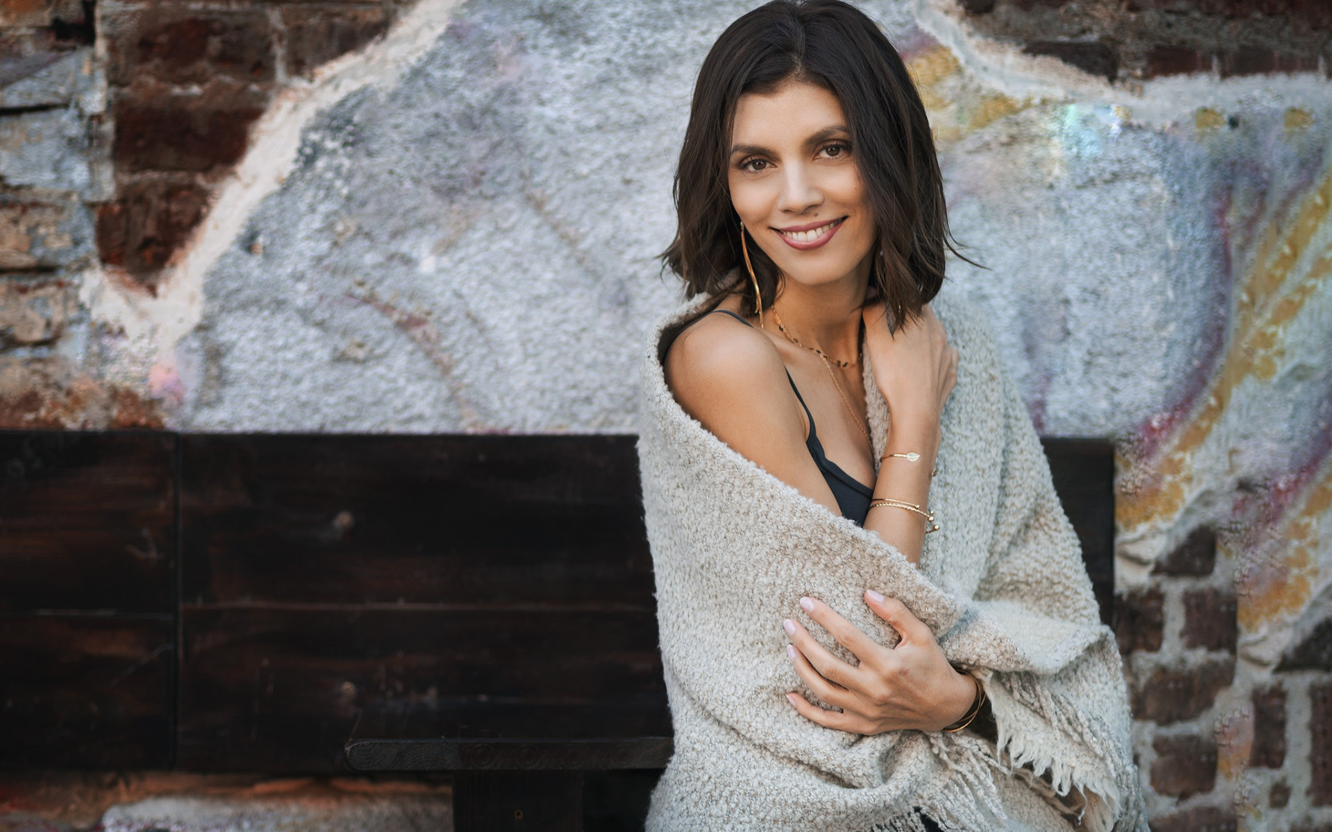 Description: A woman is sitting on a bench with a blanket over her shoulders and a brick wall behind her.
