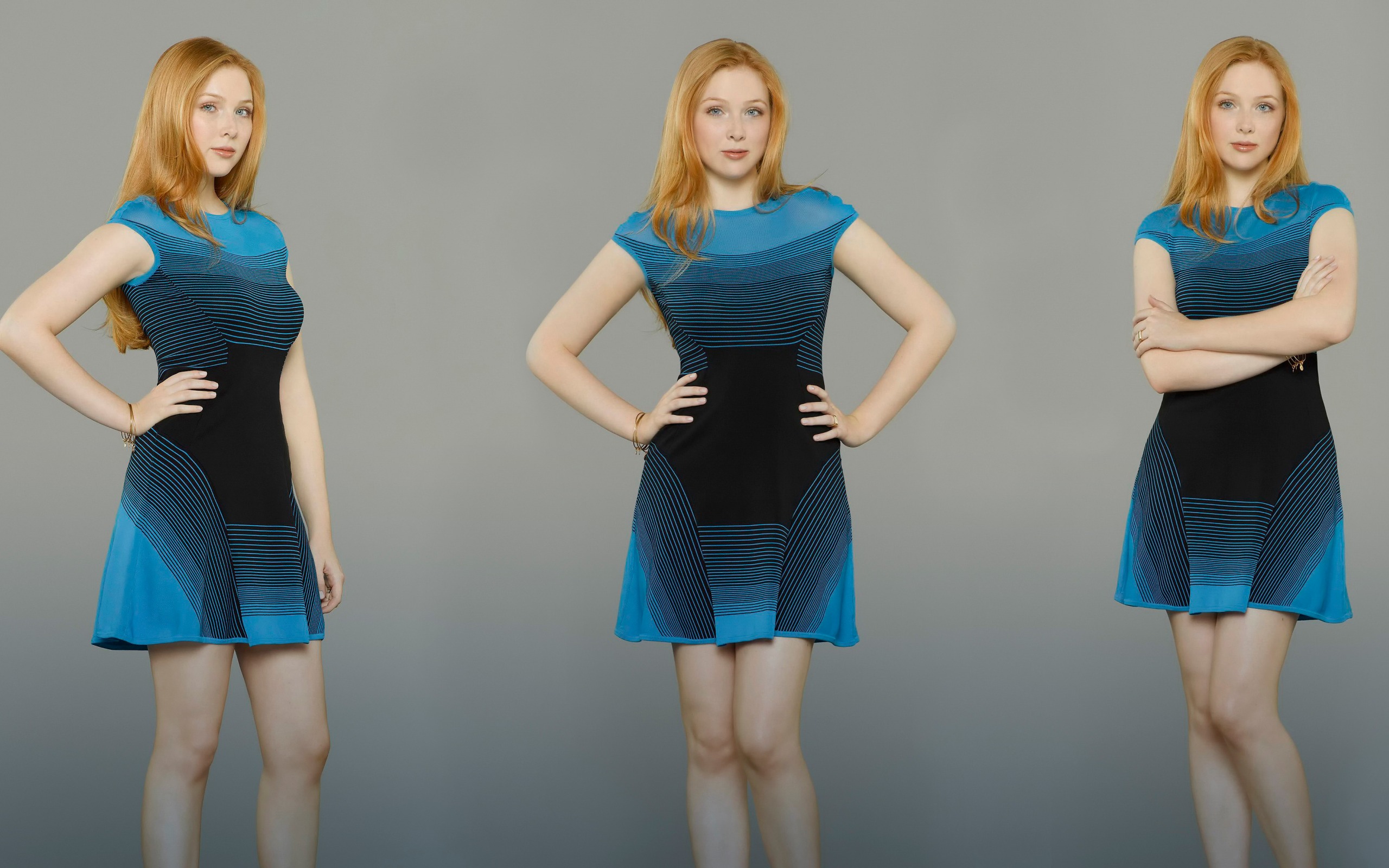 Description: A woman in a short dress poses for a picture with her hands on her hips and her hands on her hips.