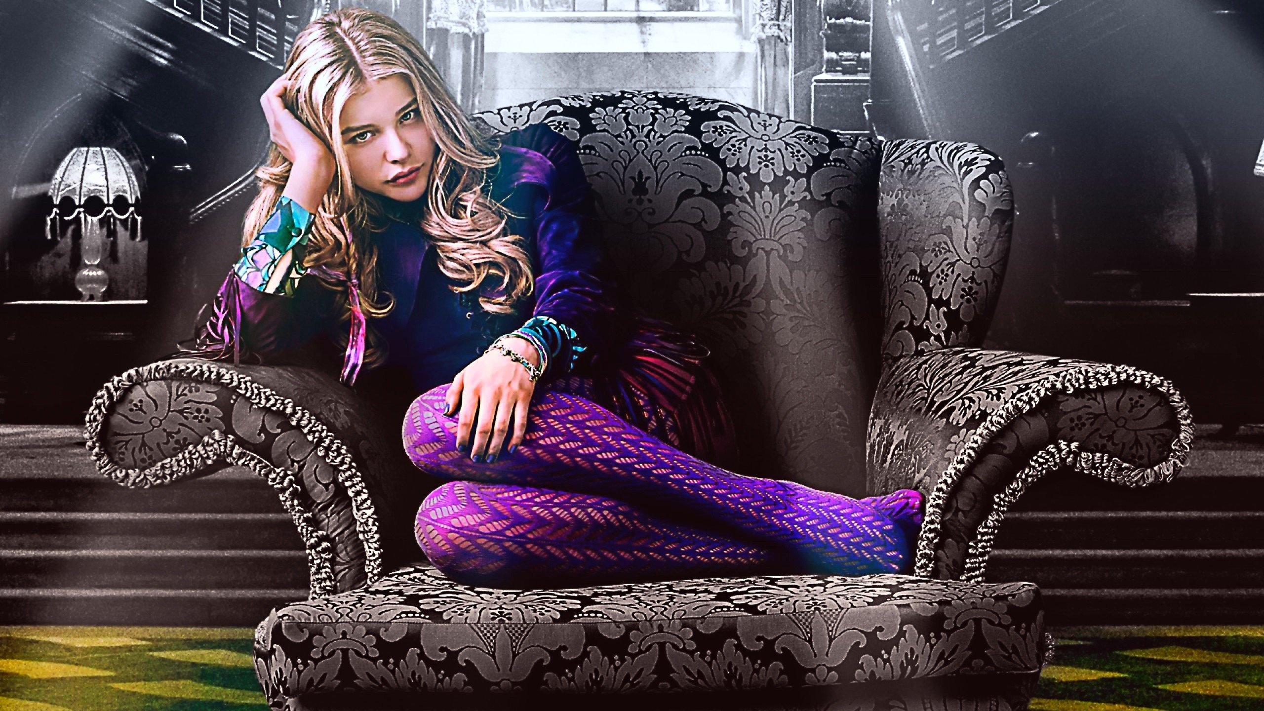 Description: A woman sitting on a chair in a room with a light shining on her face and a chair with a patterned back and arms.