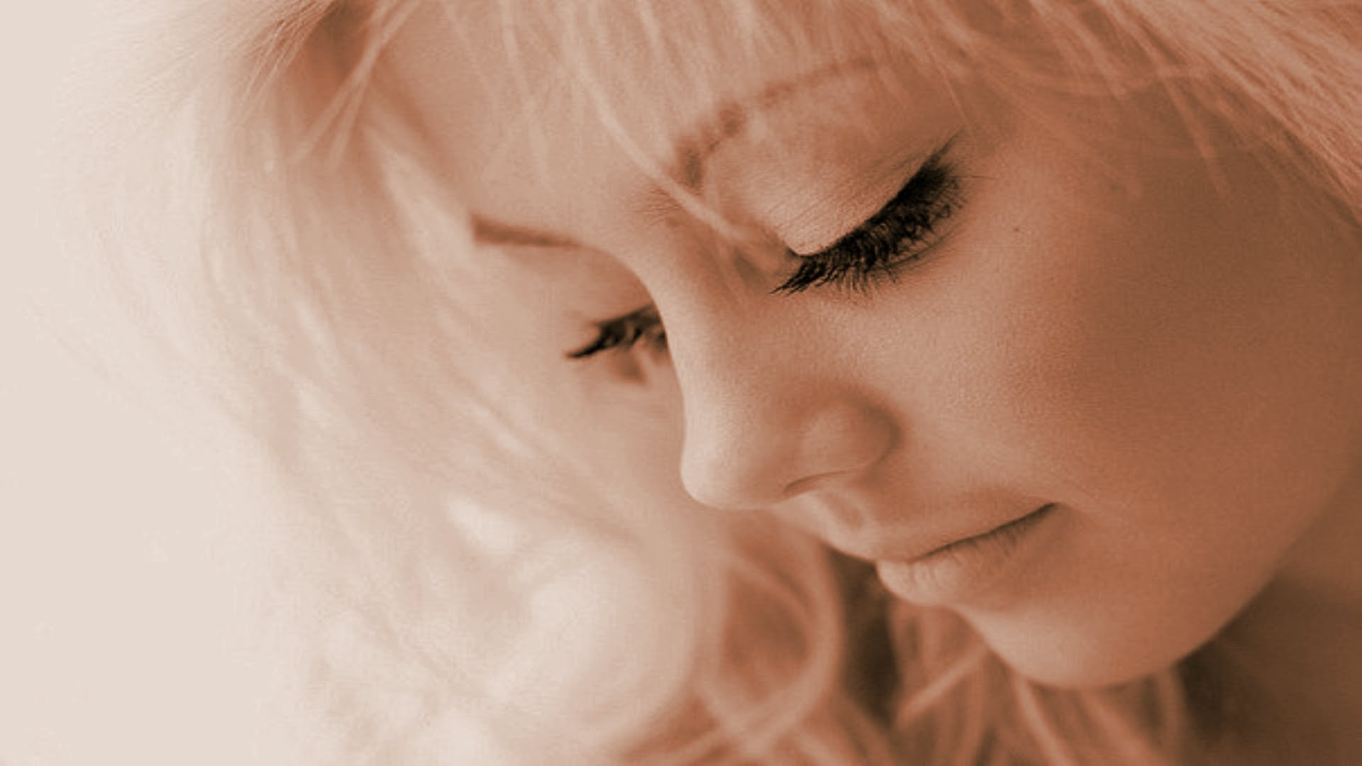 Description: A woman with long blonde hair and a black and white photo of her face and eyes closed and her eyes closed.