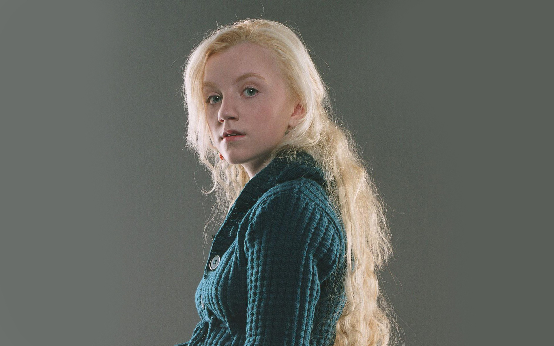 Description: A woman with long blonde hair and a green jacket on posing for a picture with a gray background and a black background.