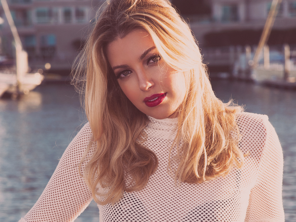 Description: A woman with long blonde hair and a red lipstick posing for a picture in front of a body of water.