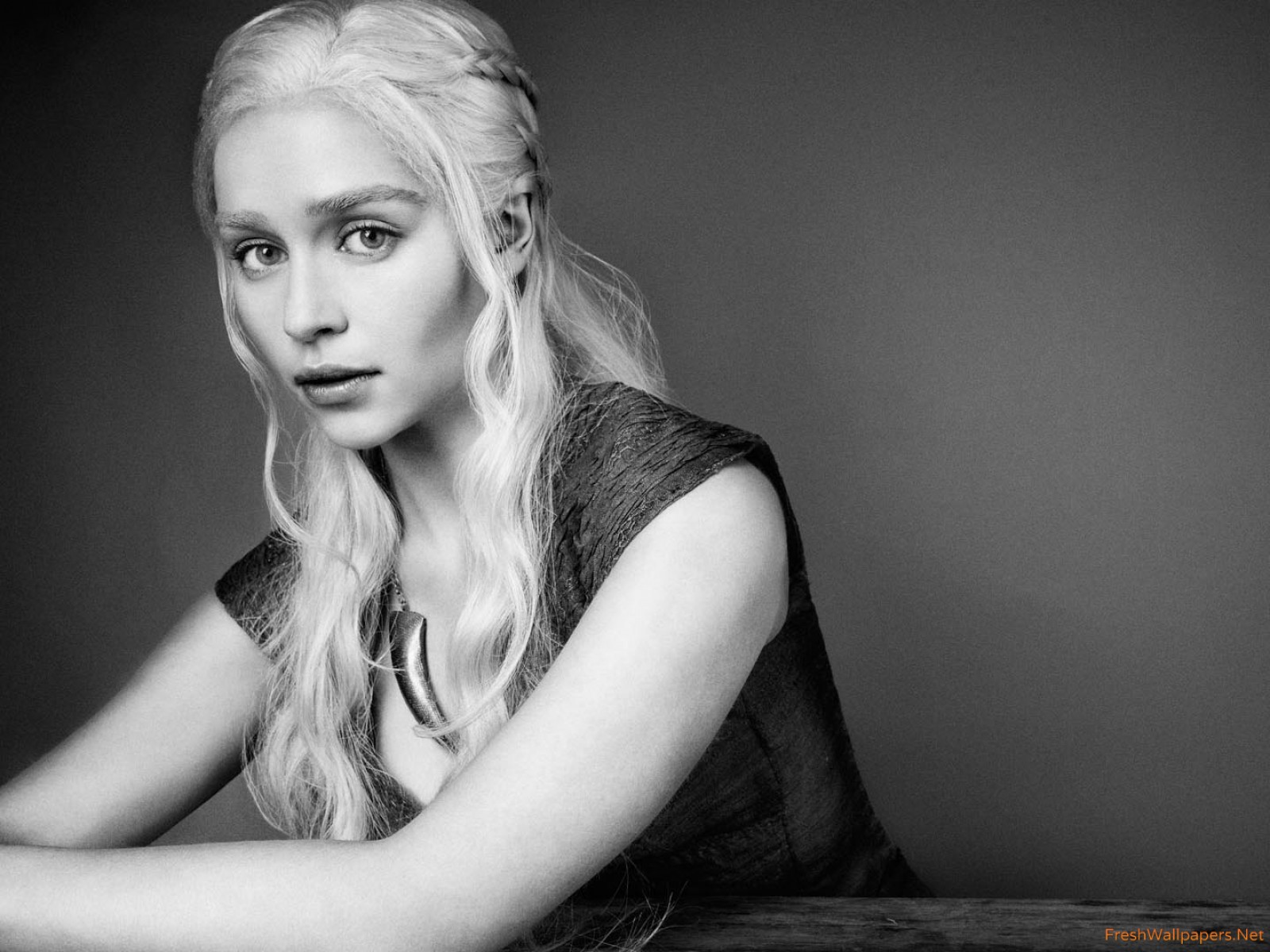 Description: A woman with long blonde hair sitting at a table with a knife in her hand and looking at the camera.