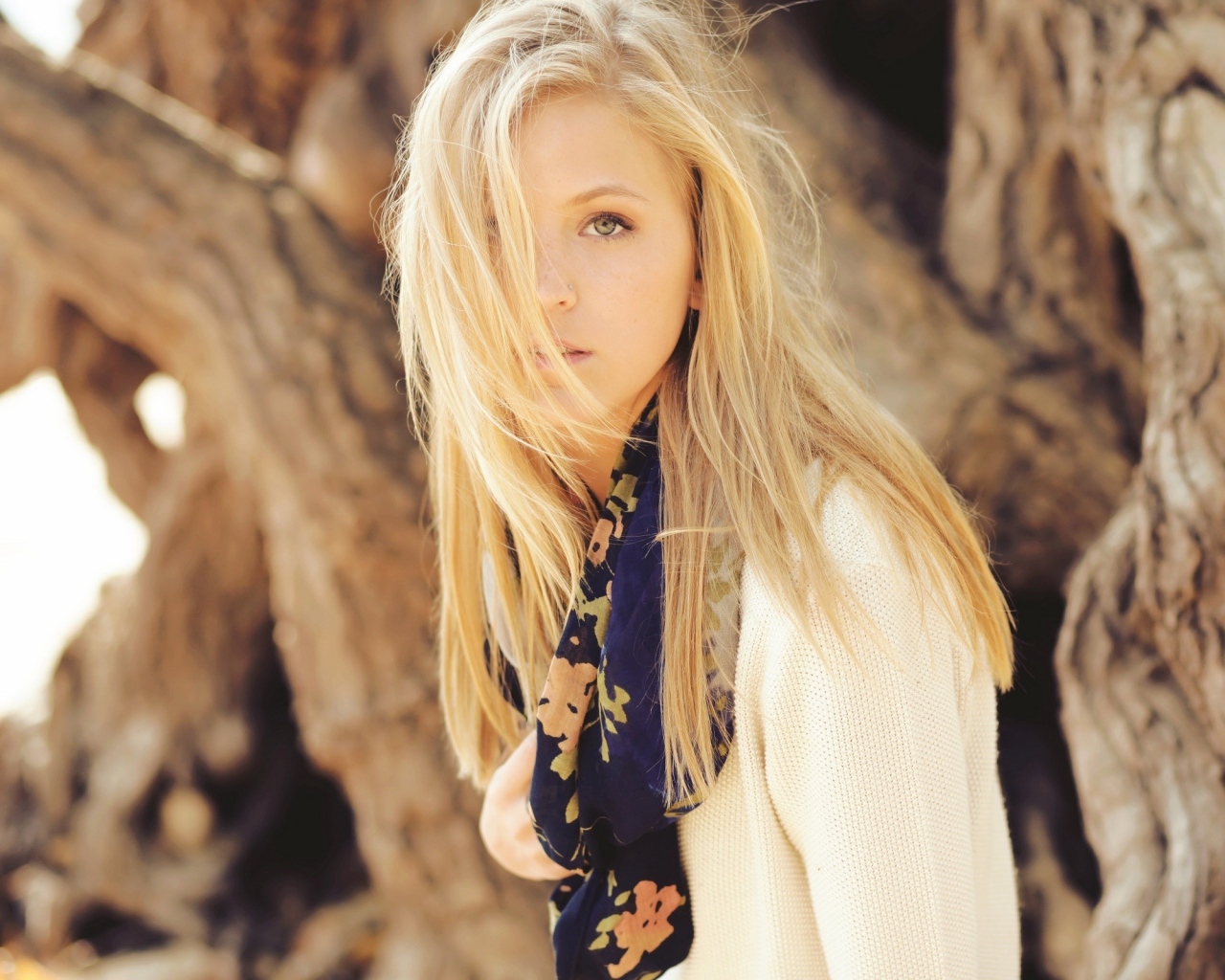 Description: A woman with long blonde hair standing in front of a tree with a scarf around her neck and a sweater over her shoulders.
