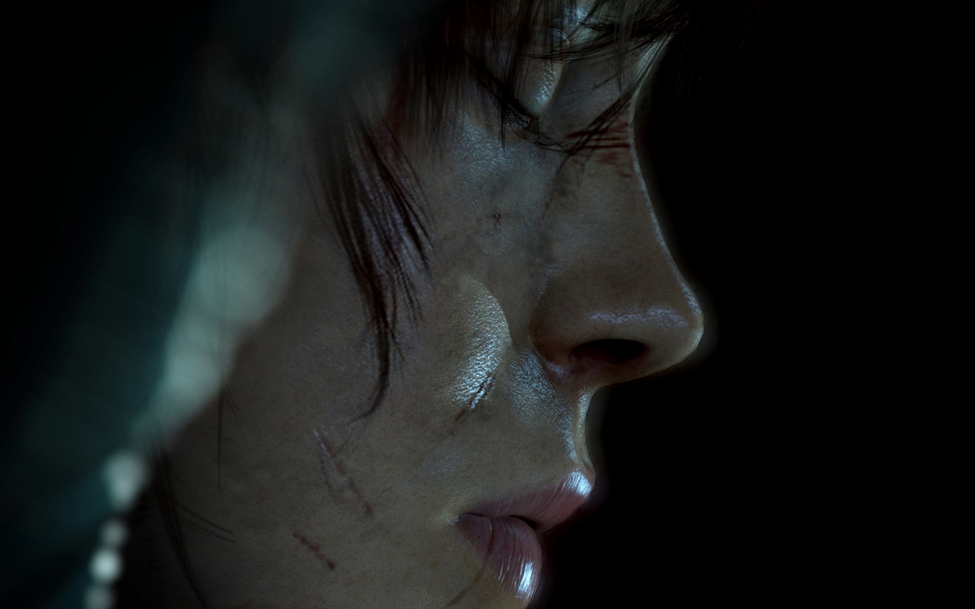 Description: A woman with her mouth open in the dark with blood on her face and nose.