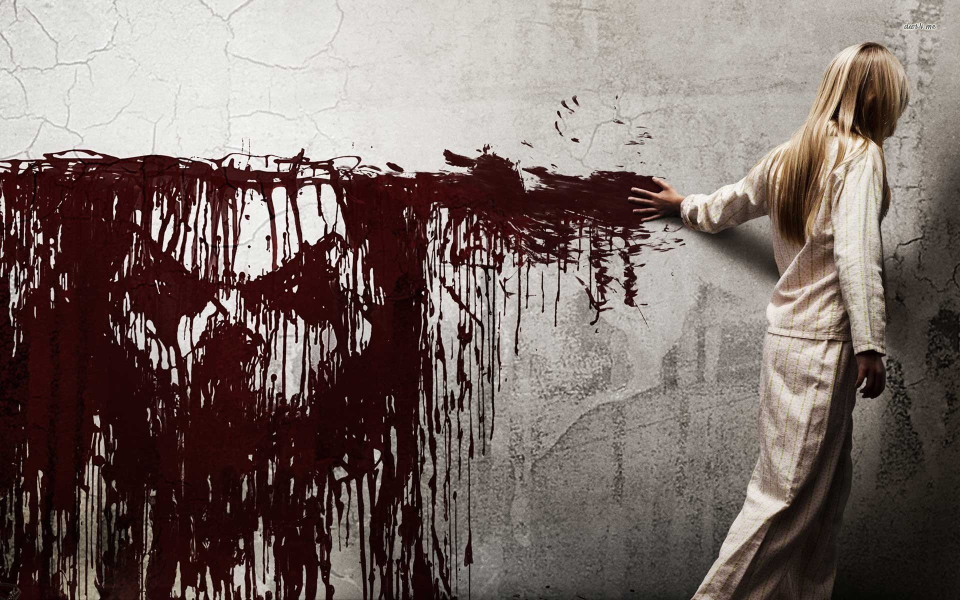 Description: A woman is holding a bloodied wall with a red paint driping on it and a white wall behind her.
