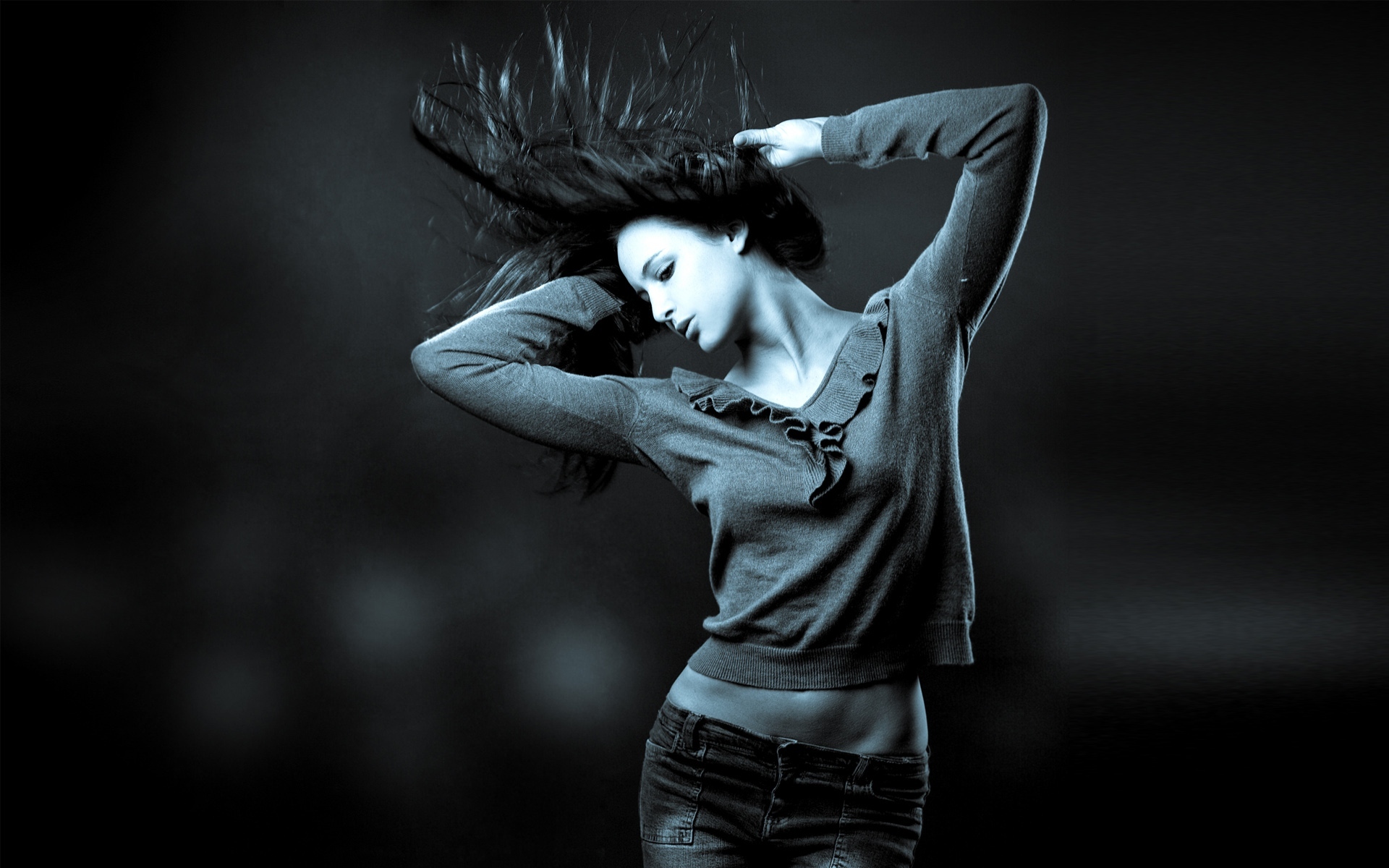 Description: A woman with her hair blowing in the wind with her hands behind her head and her hair in the air.