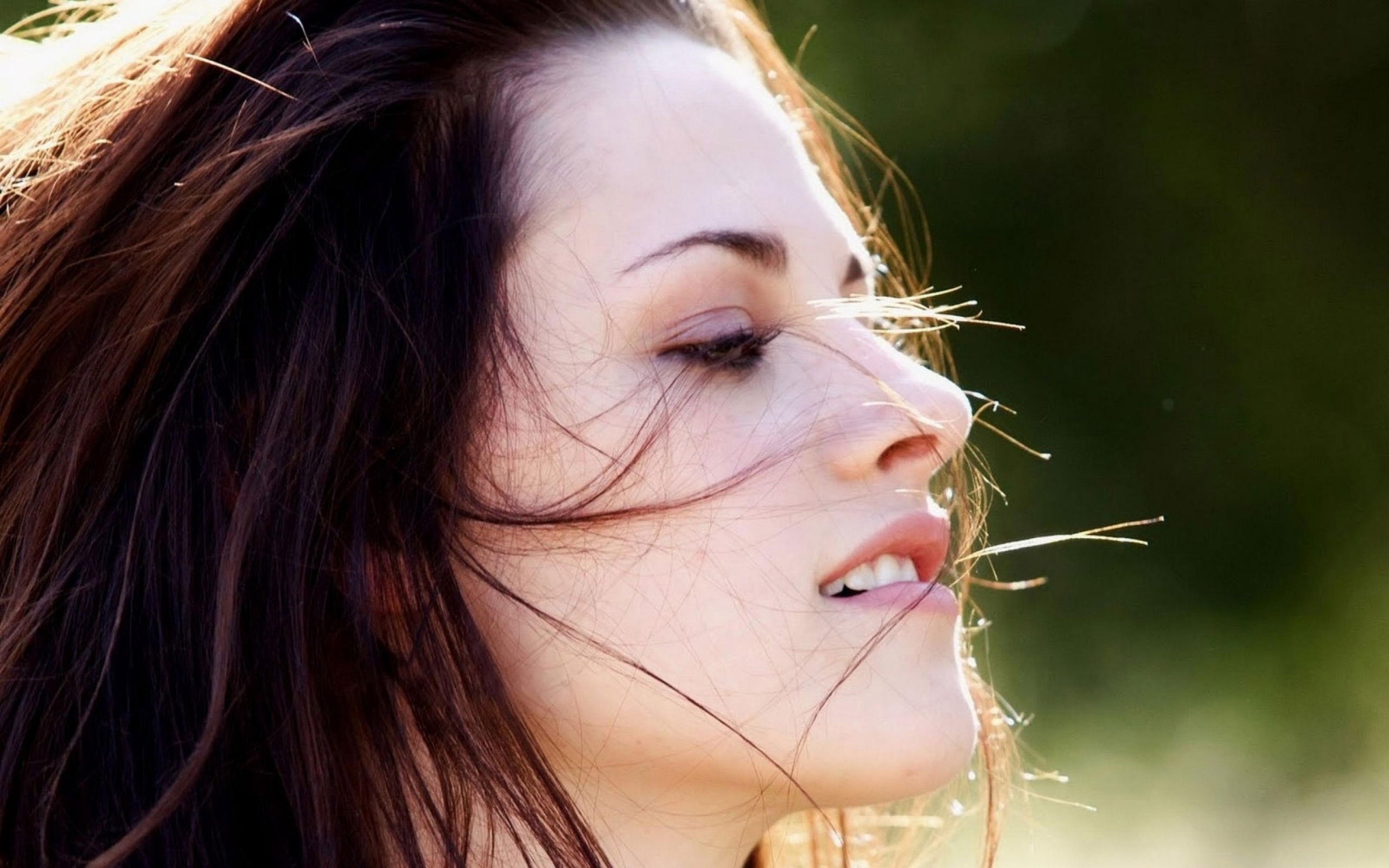 Description: A woman with long hair blowing in the wind with her eyes closed and her hair blowing back in the wind.