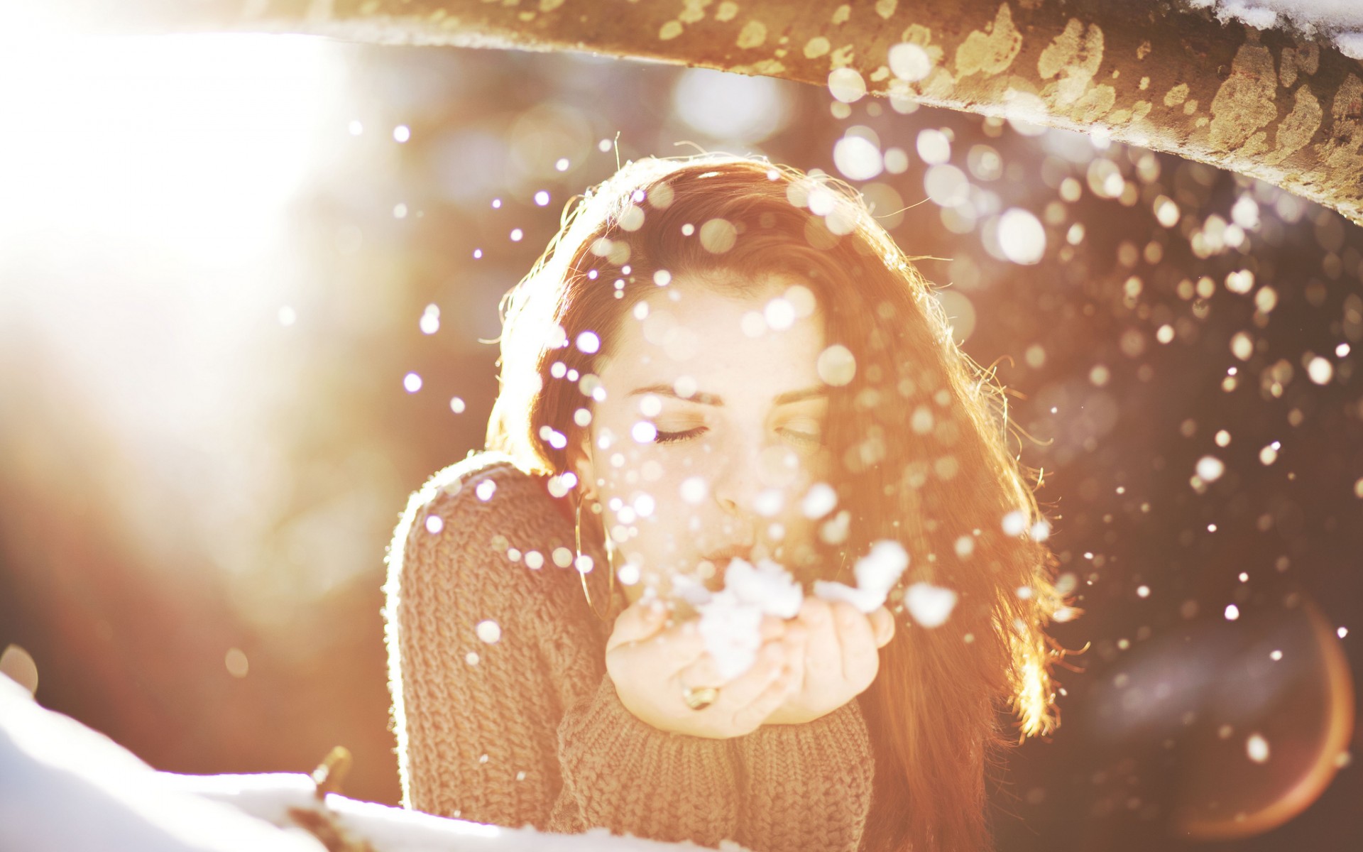 Description: A woman blowing her nose while standing in the snow with her hands on her face and looking at the snow falling.