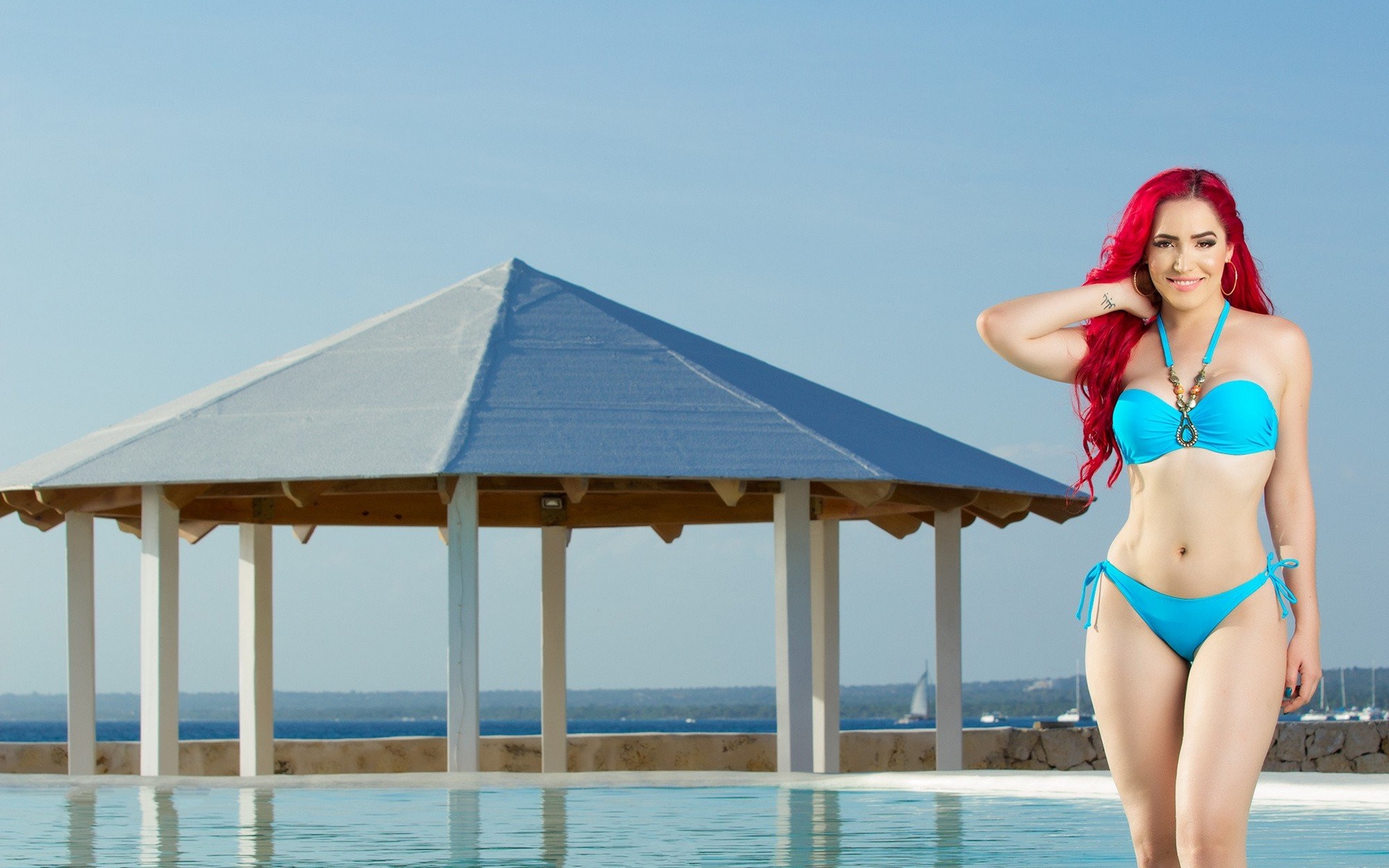 Description: A woman in a blue bikini standing next to a pool with a gazebo in the background and a blue sky.