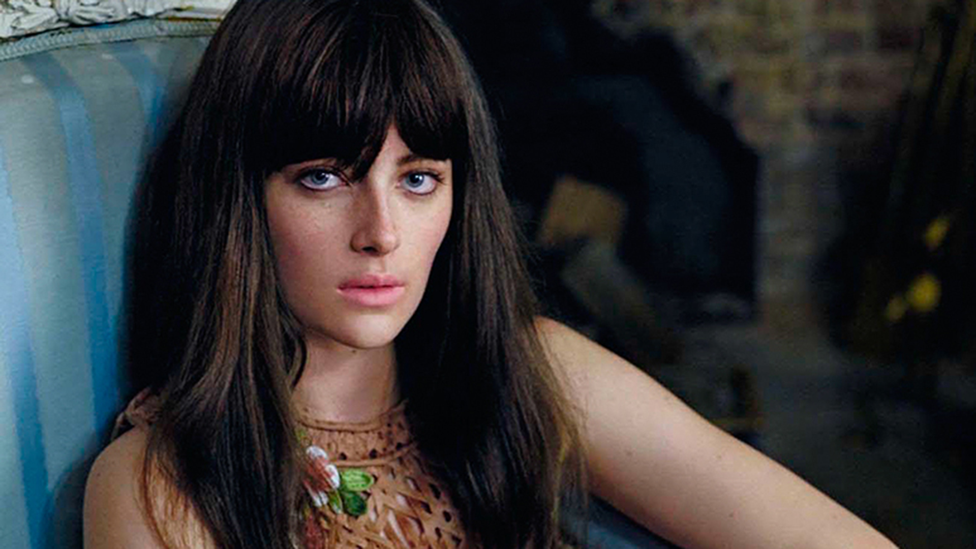 Description: A woman sitting on a blue chair with a green necklace on her neck and a blue and white striped chair.