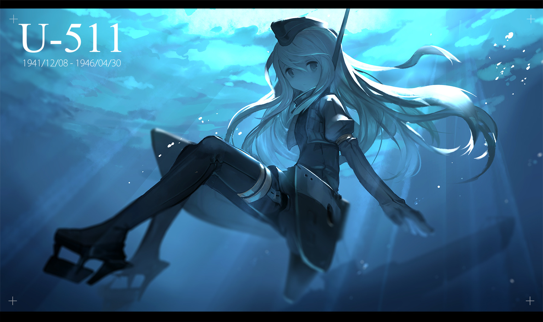 Description: A woman in a blue dress sitting on a boat under water with a sword in her hand and a sword in her hand.