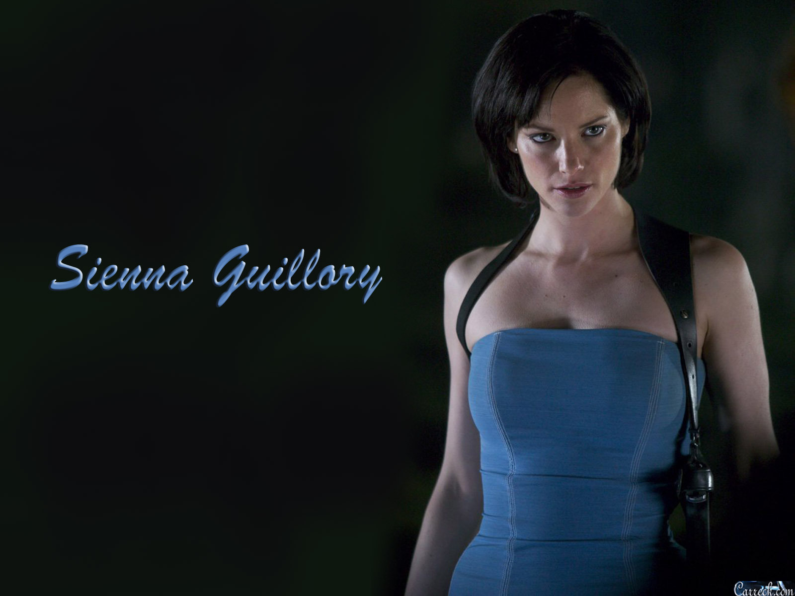 Description: A woman in a blue dress with a camera in her hand and the words sienna guillory on it.