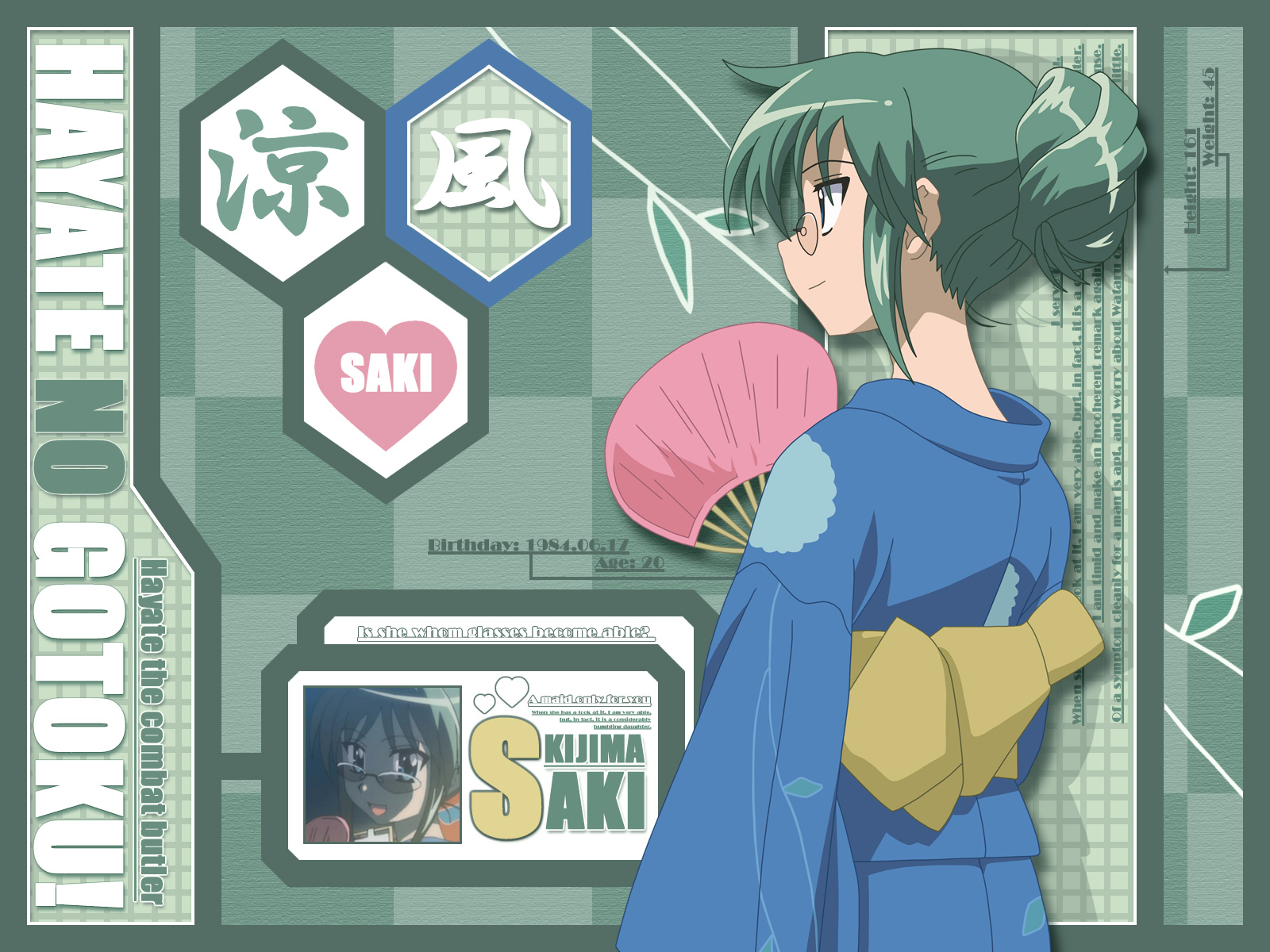 Description: A woman in a blue dress holding a fan and a pink fan in her hand and a green background.