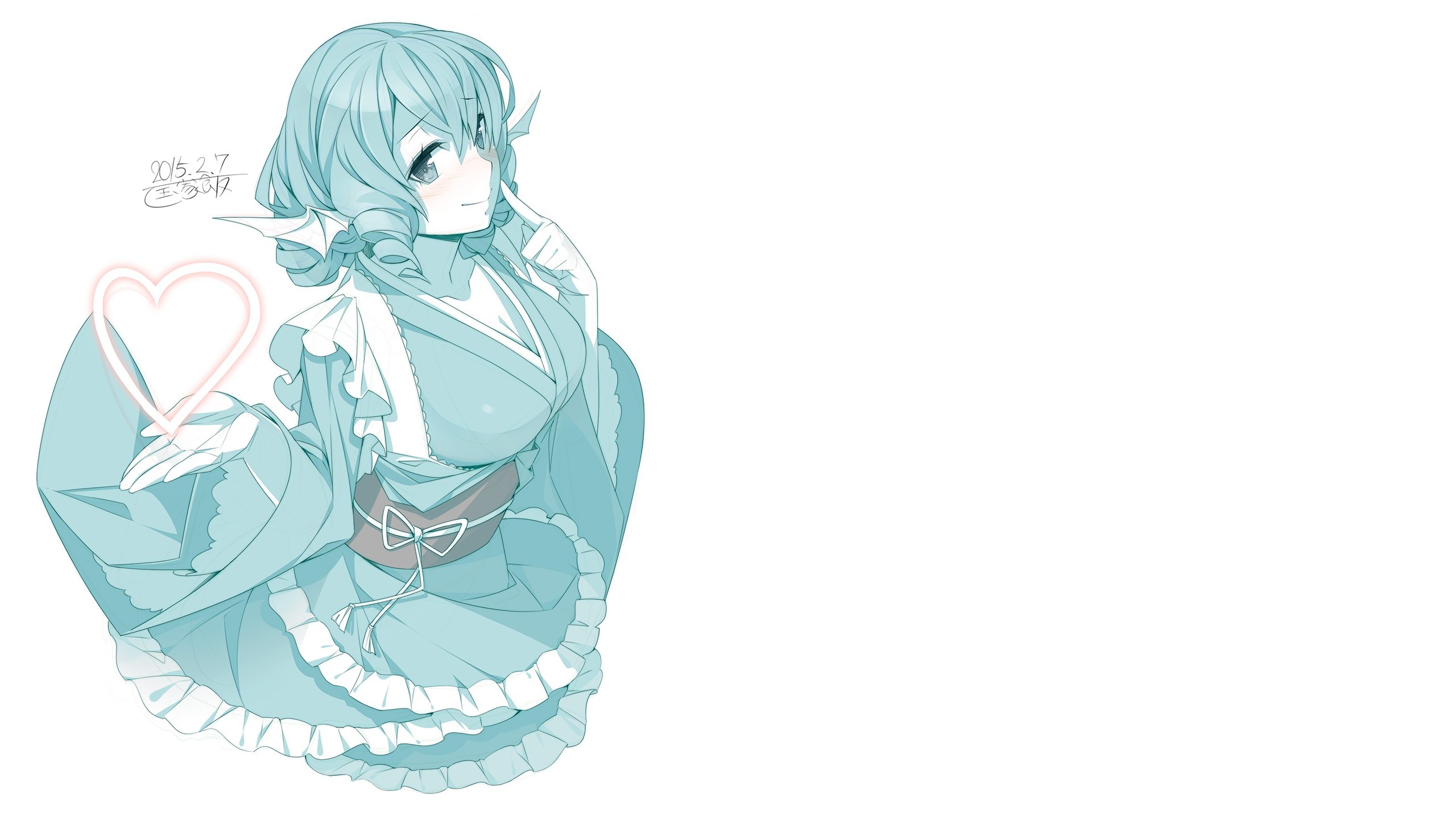 Description: A drawing of a woman in a blue dress with a heart on her chest and a bow in her hair.