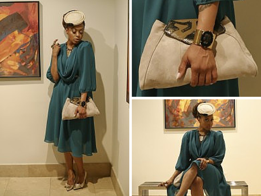 Description: A woman in a blue dress holding a purse and a purse bag in her hand and a woman in a blue dress holding a purse and a white purse.