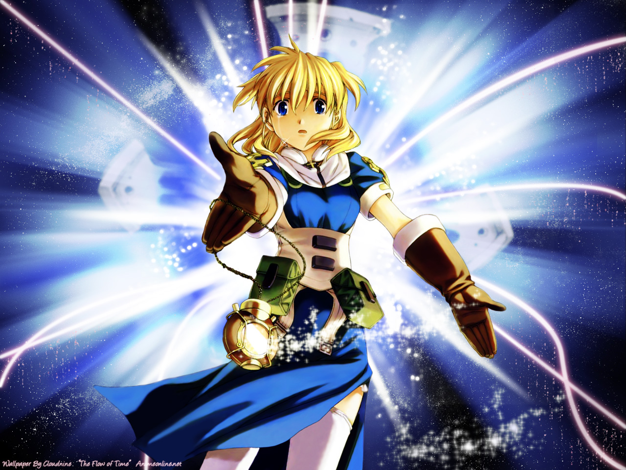Description: A woman in a blue dress holding a light saber in her hand and a blue background with stars and a light.