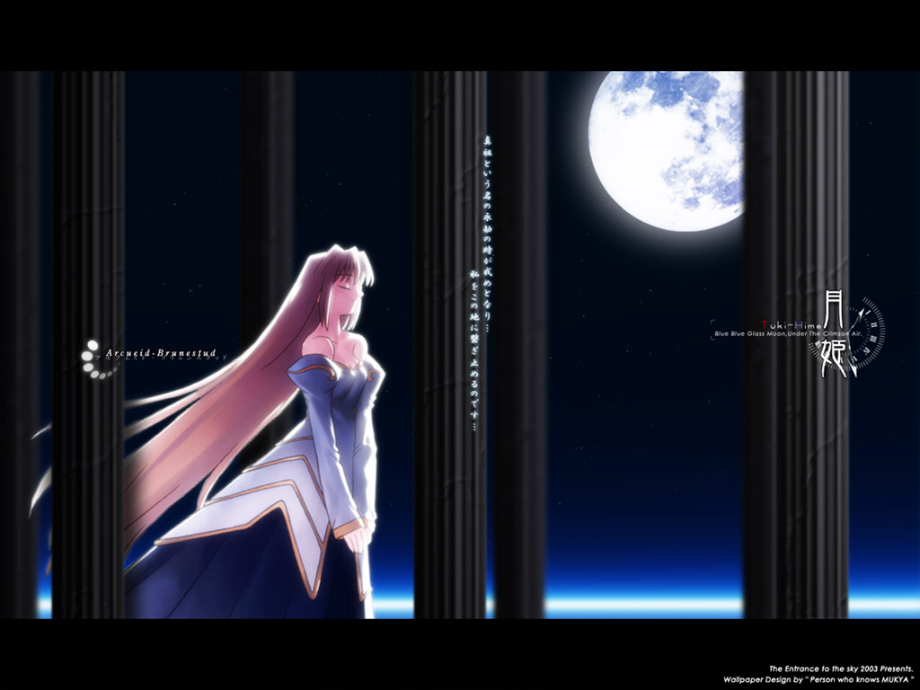 Description: A woman in a blue dress standing in front of a full moon and columns with columns in the background.