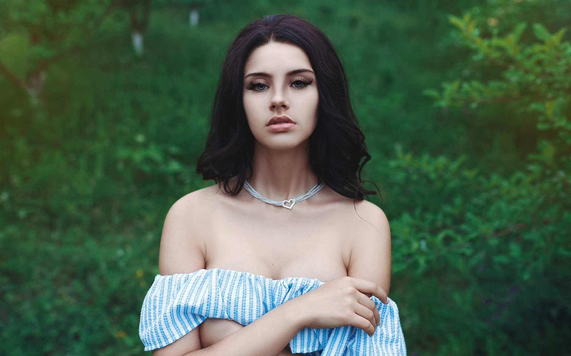 Description: A woman with a blue dress and a necklace on her neck standing in a field of grass and trees.