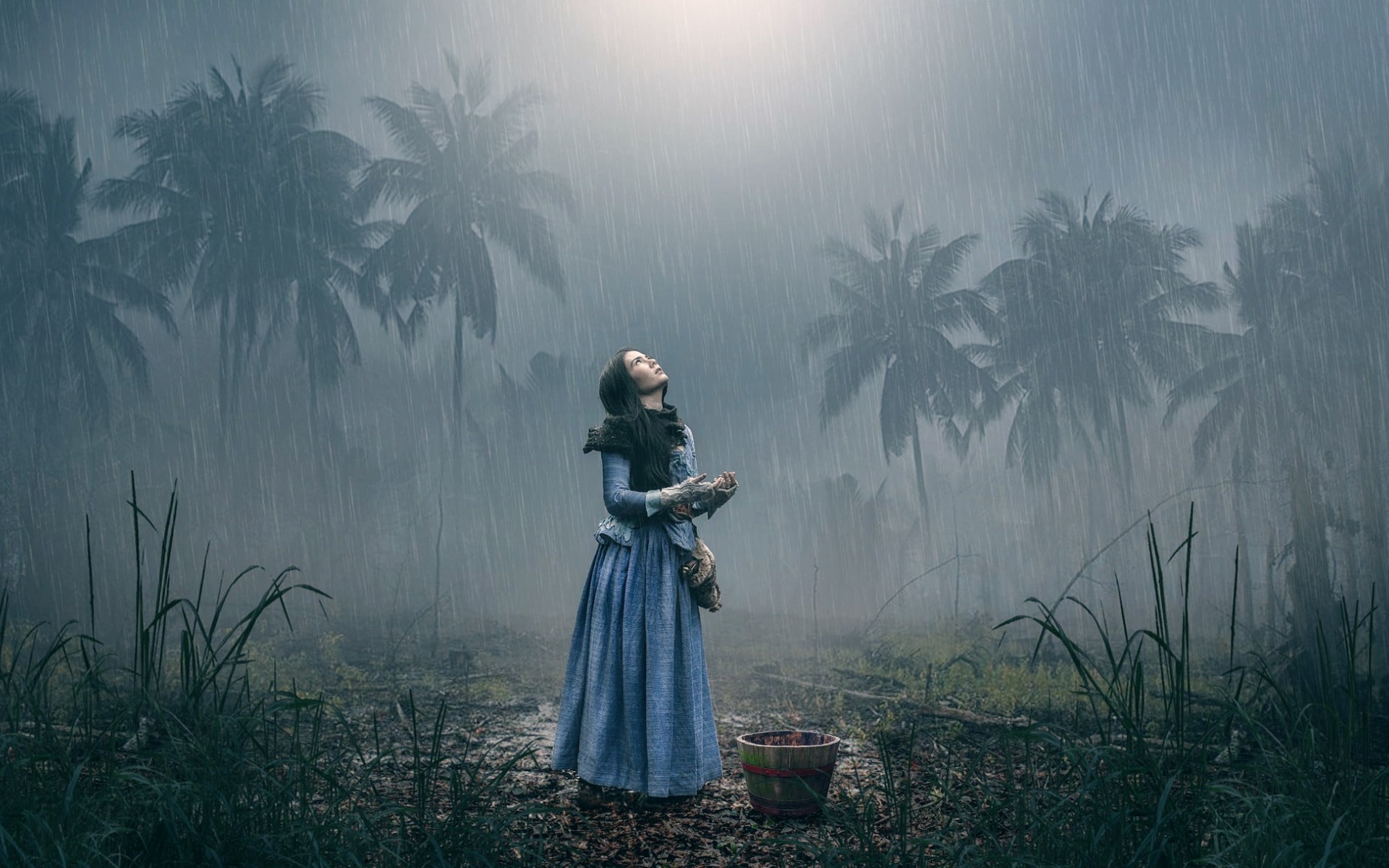 Description: A woman in a blue dress standing in the rain with her arms around her head and a basket of flowers.