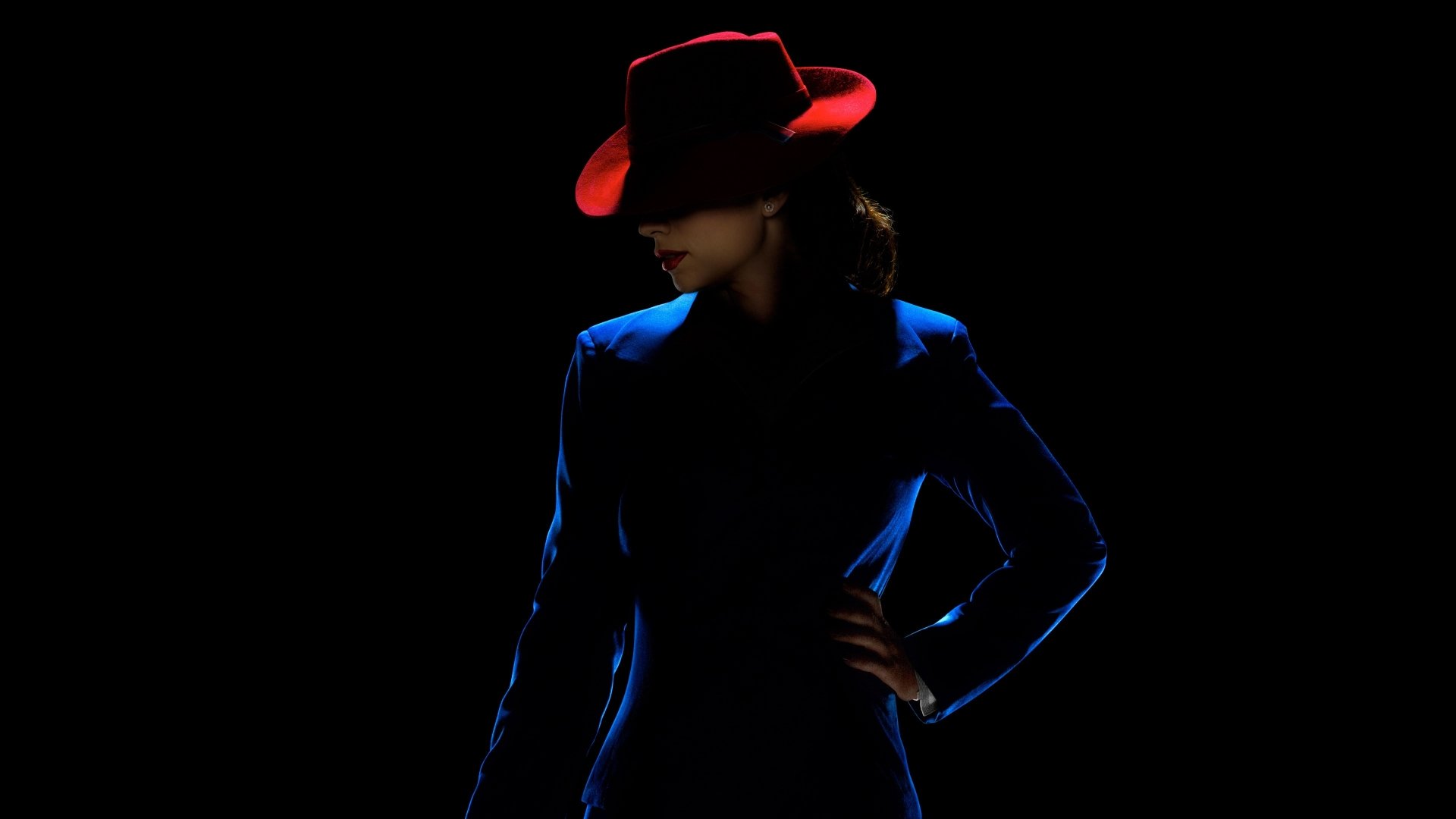Description: A woman in a blue dress and a red hat is standing in the dark with her hands on her hips.