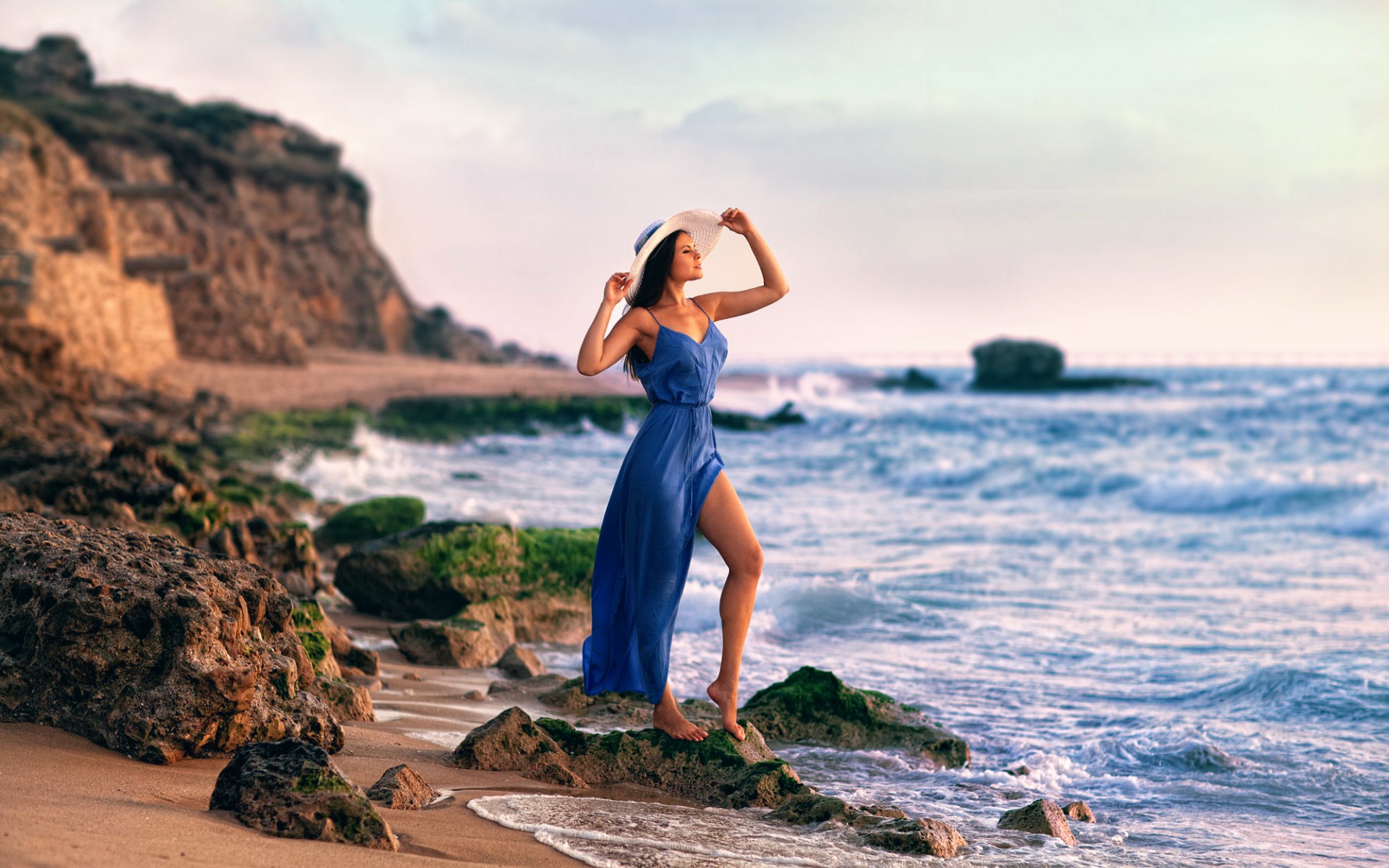 Description: A woman in a blue dress standing on a rock by the ocean with a hat on her head and a body of water in the background.