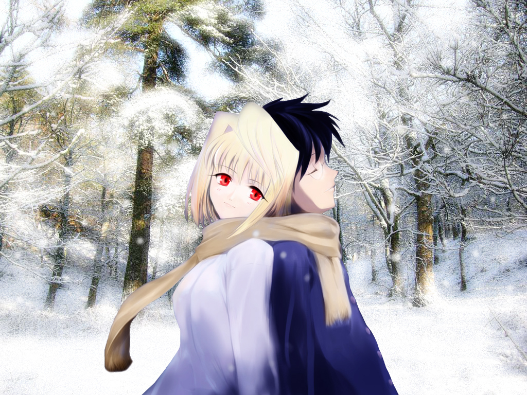 Description: A woman in a blue dress standing in the snow with a scarf around her neck and red eyes.
