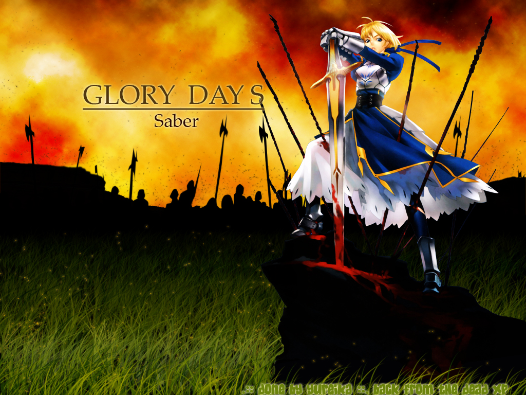 Description: A woman in a blue dress holding a sword in front of a fire filled sky with a banner that reads glory days saber.