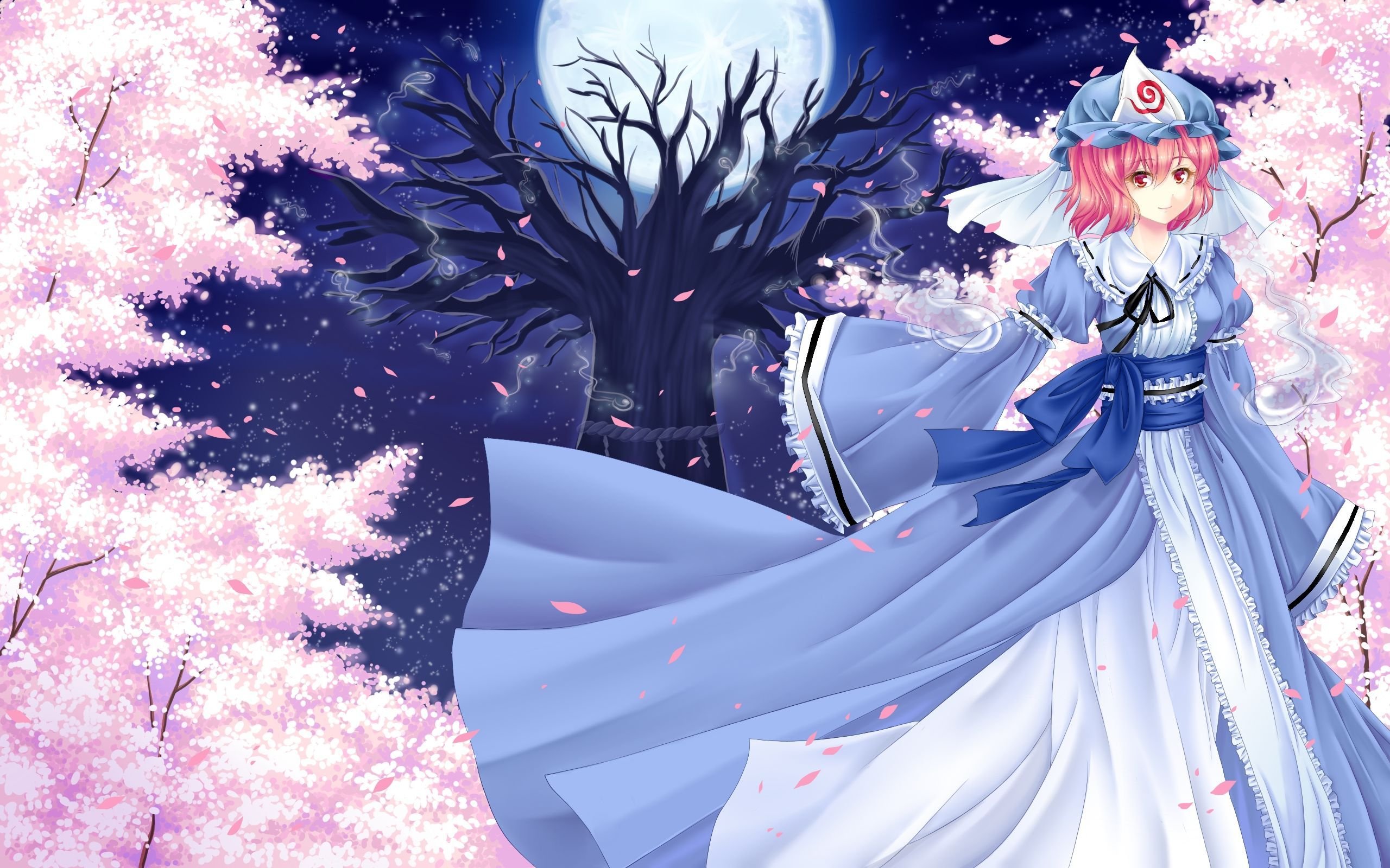 Description: A woman in a blue dress and a tree with pink flowers in the background and a full moon in the sky.
