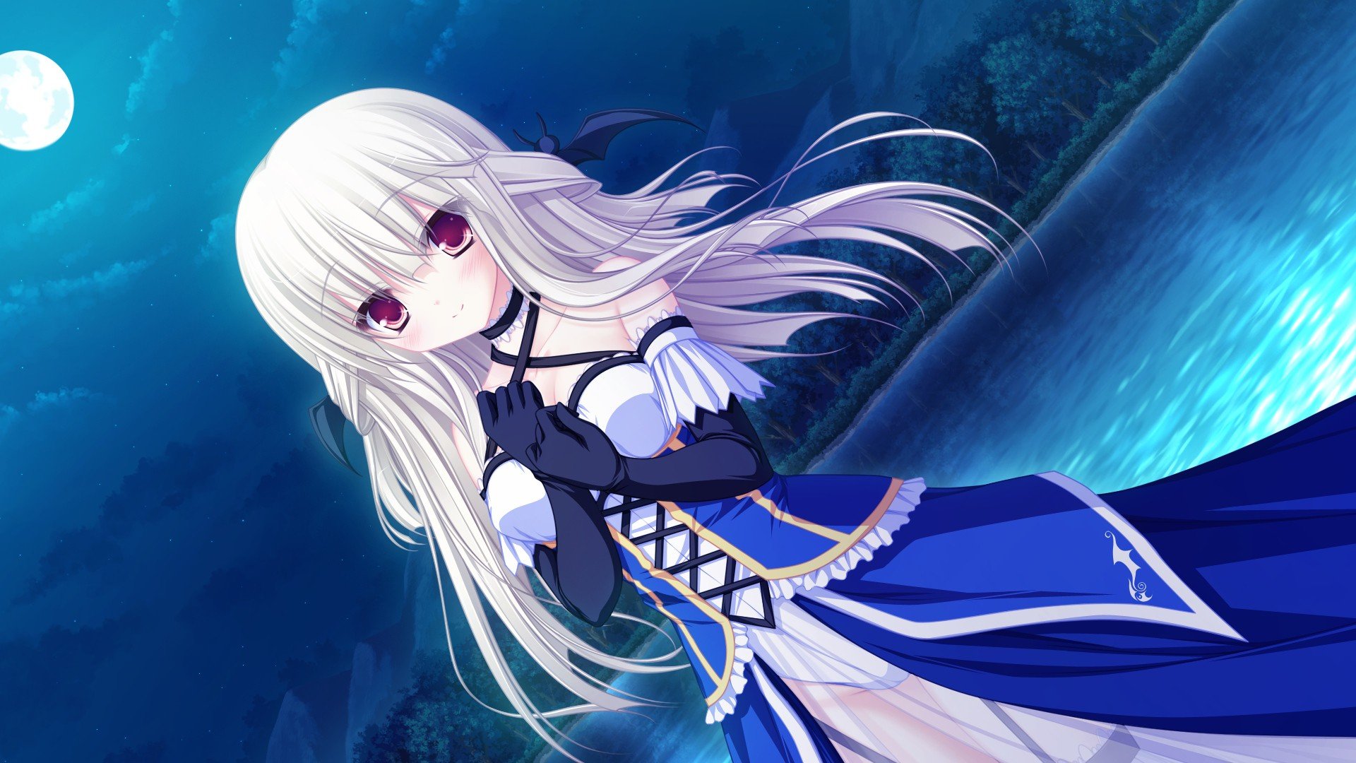Description: A woman in a blue dress standing in front of a waterfall with a full moon in the background and a blue sky.