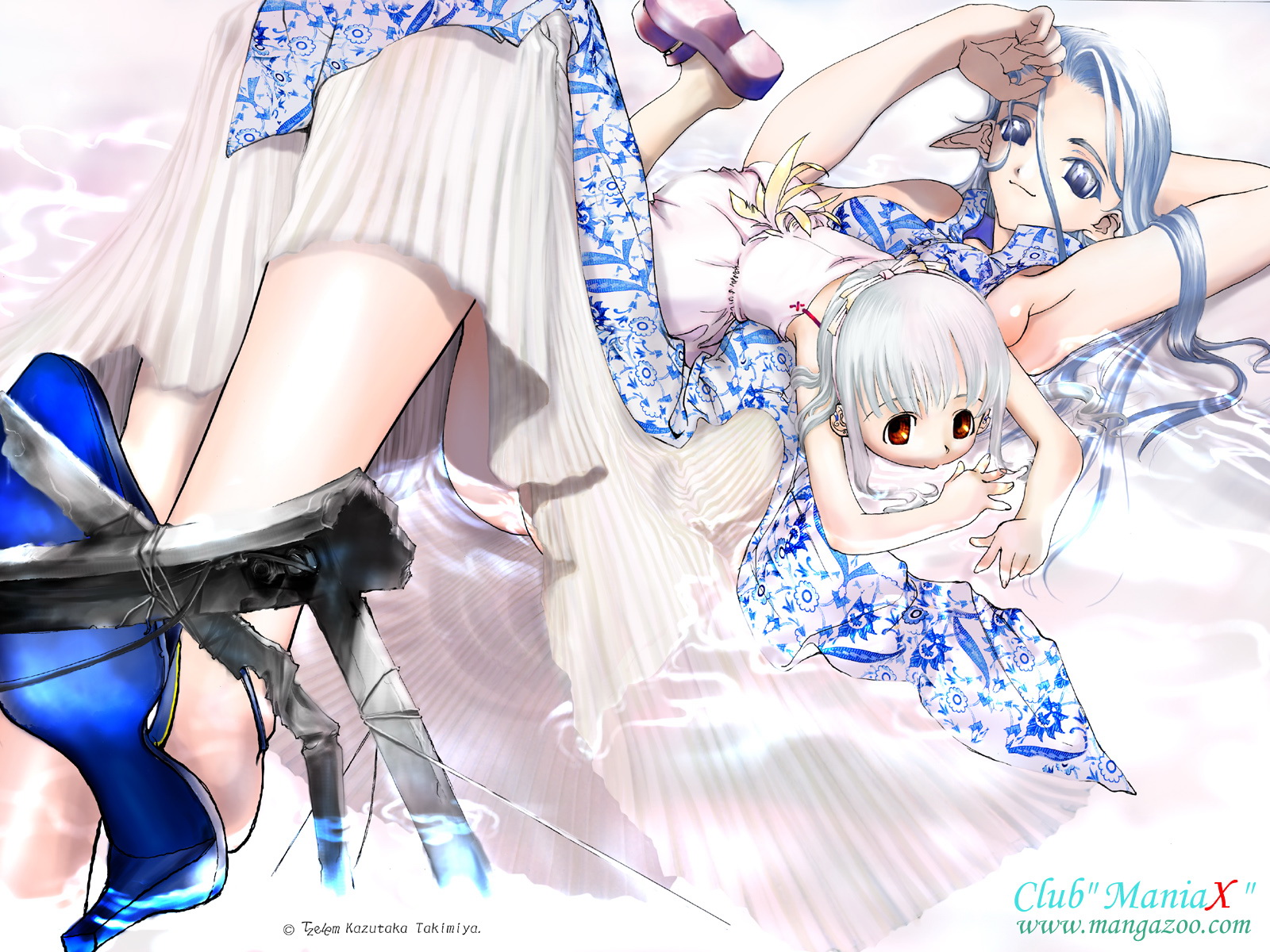 Description: A woman in a blue dress and a woman in a white dress with a high heeled shoe are laying on a bed.