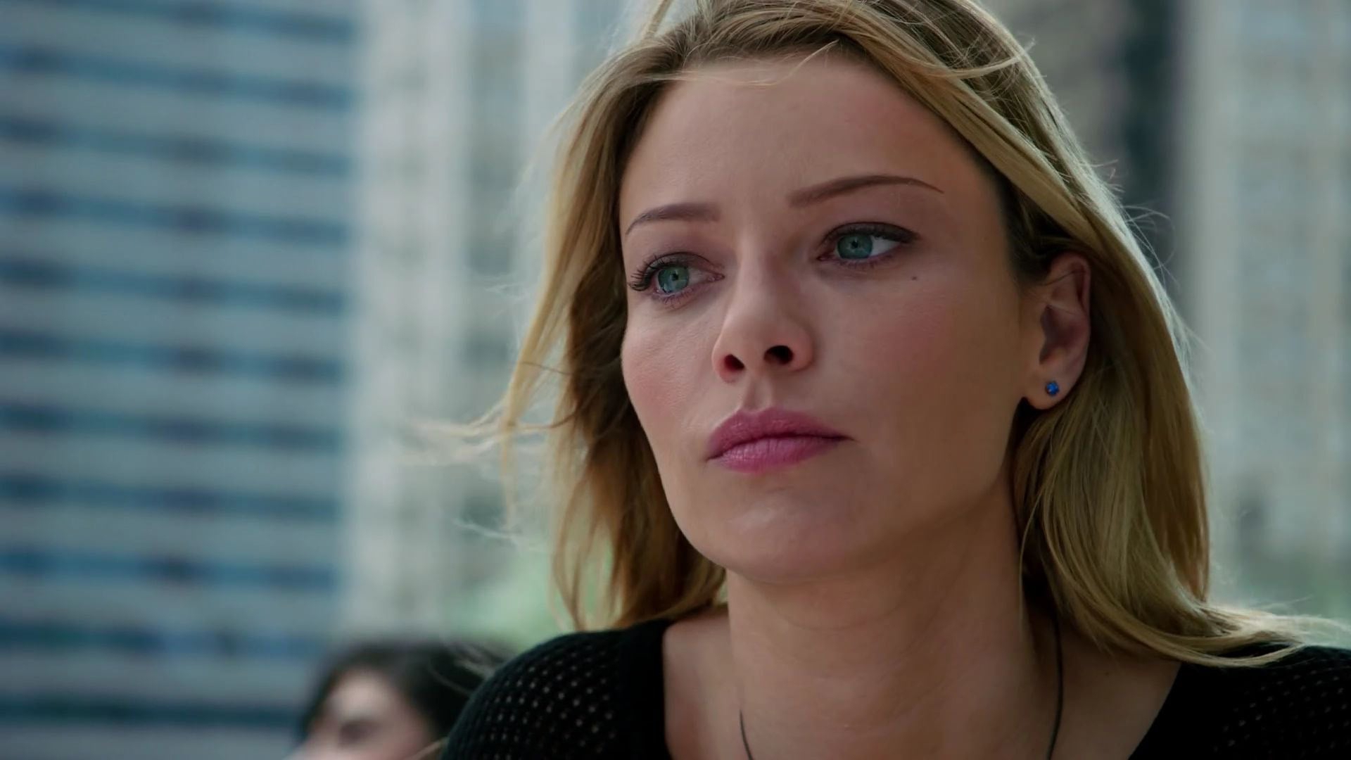 Description: A woman with blue eyes looking at something in the distance with a city in the background with skyscrapers in the background.