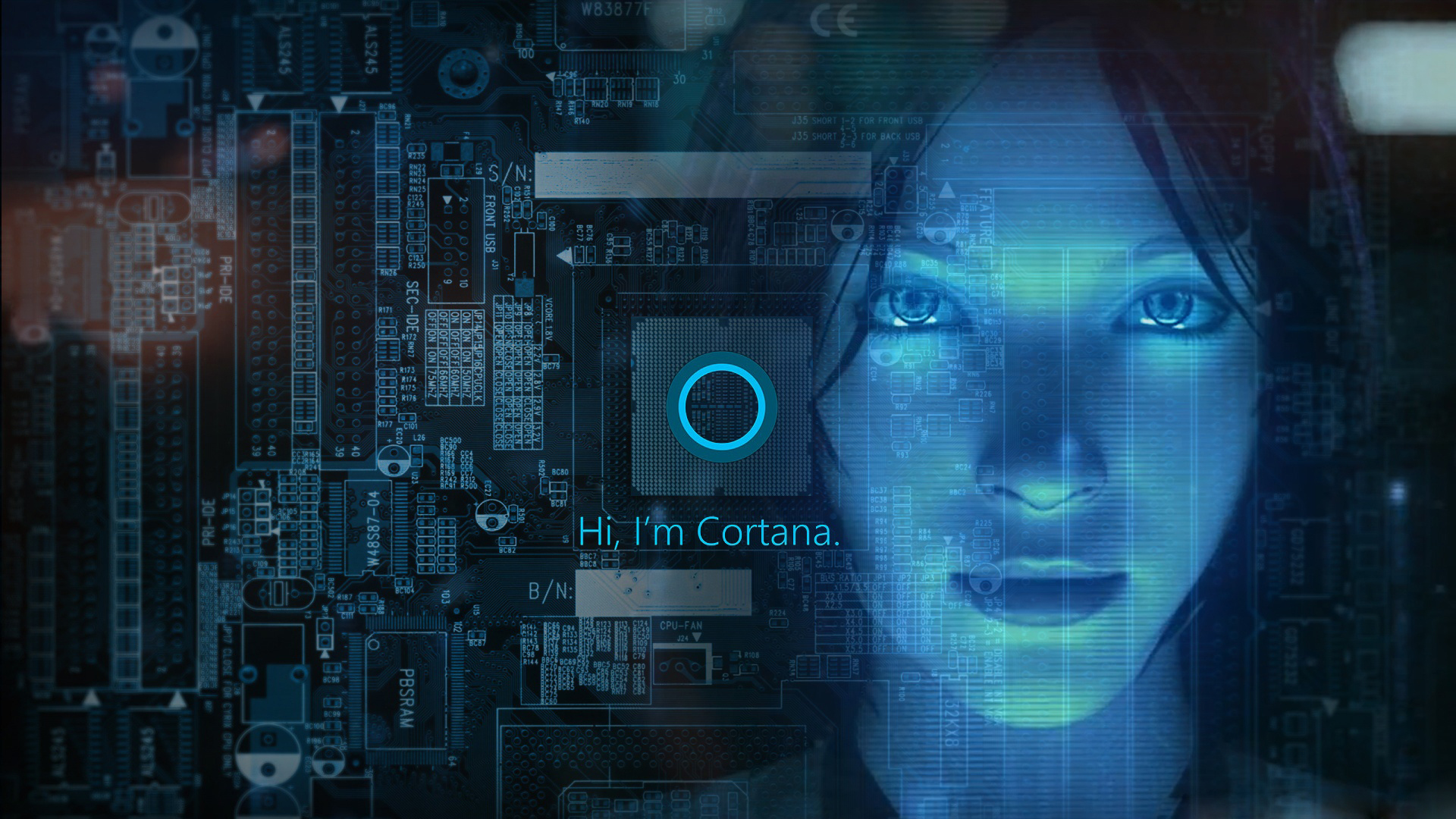Description: A woman with blue eyes and a face with the words hi in corona on it's face and a circuit board in the background.