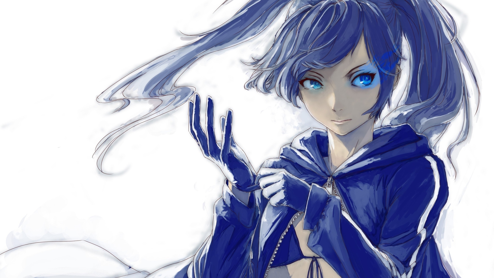 Description: A drawing of a woman with blue eyes and a hoodie on.