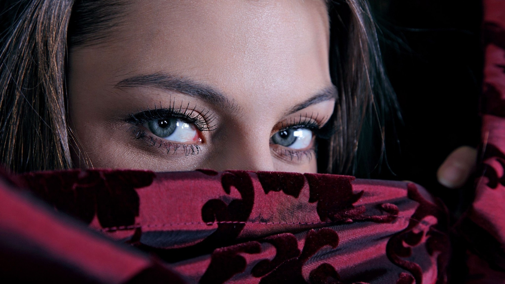 Description: A woman with blue eyes hiding behind a red blanket with her eyes open and her hair in the wind.