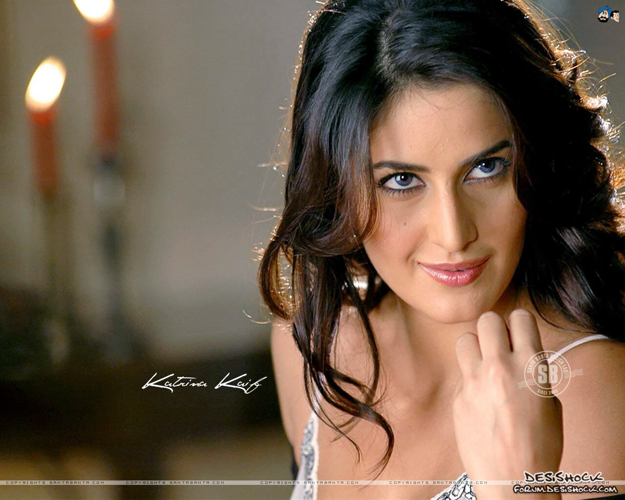 Description: A woman with blue eyes and a ring on her finger posing for a picture in a room with candles.