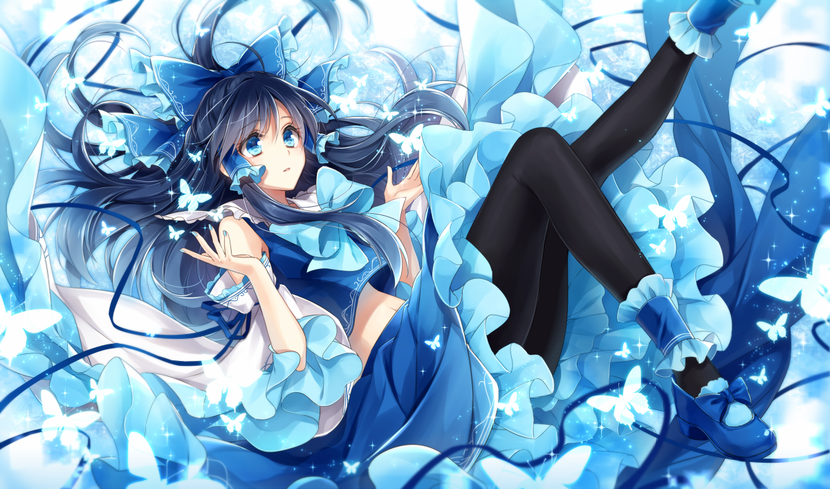 Description: A woman laying on a bed of blue flowers with her legs up and her hair blowing in the wind.