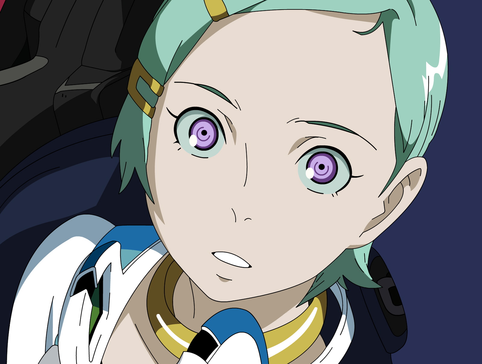 Description: A woman with blue hair and green eyes looks at the camera with a serious look on her face and chest.