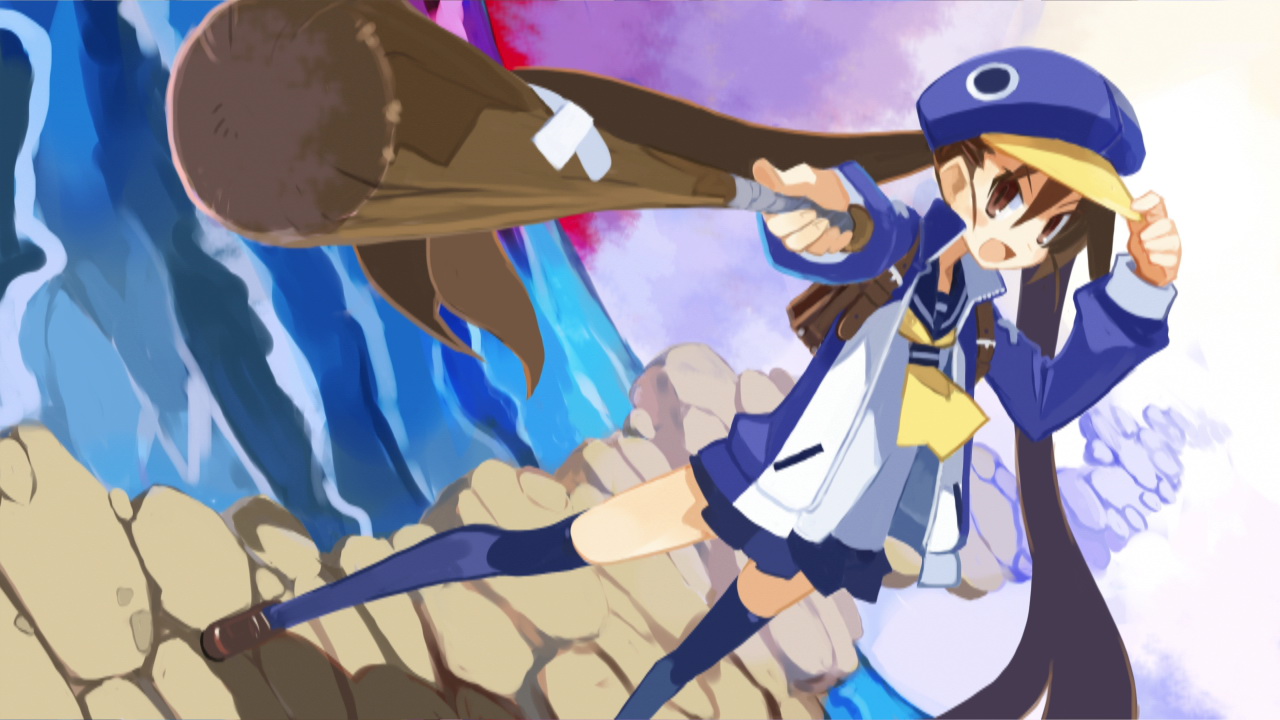 Description: A woman in a blue hat and a bird flying over her head and a rock wall behind her and a bird flying over her head.
