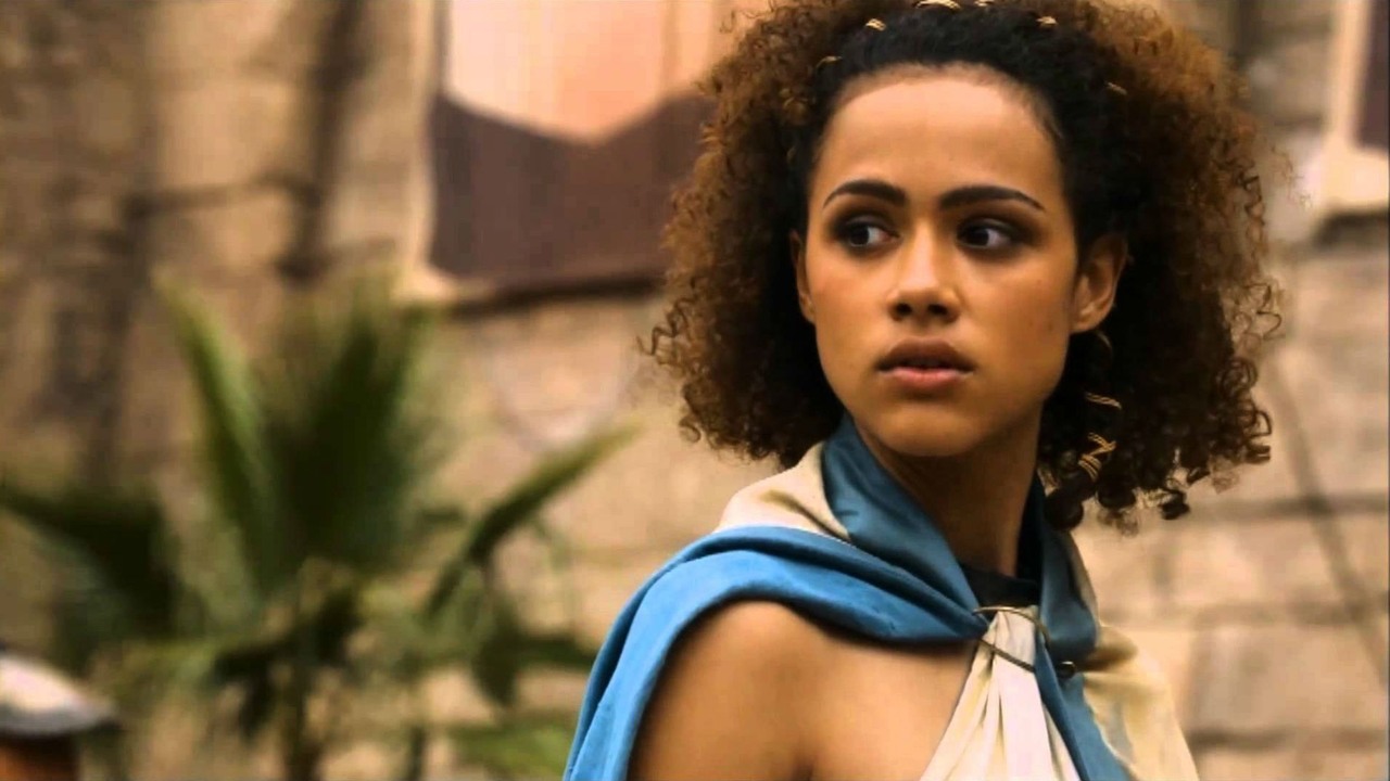 Description: A woman with a blue scarf around her neck and a brick building in the background with a palm tree in the foreground.