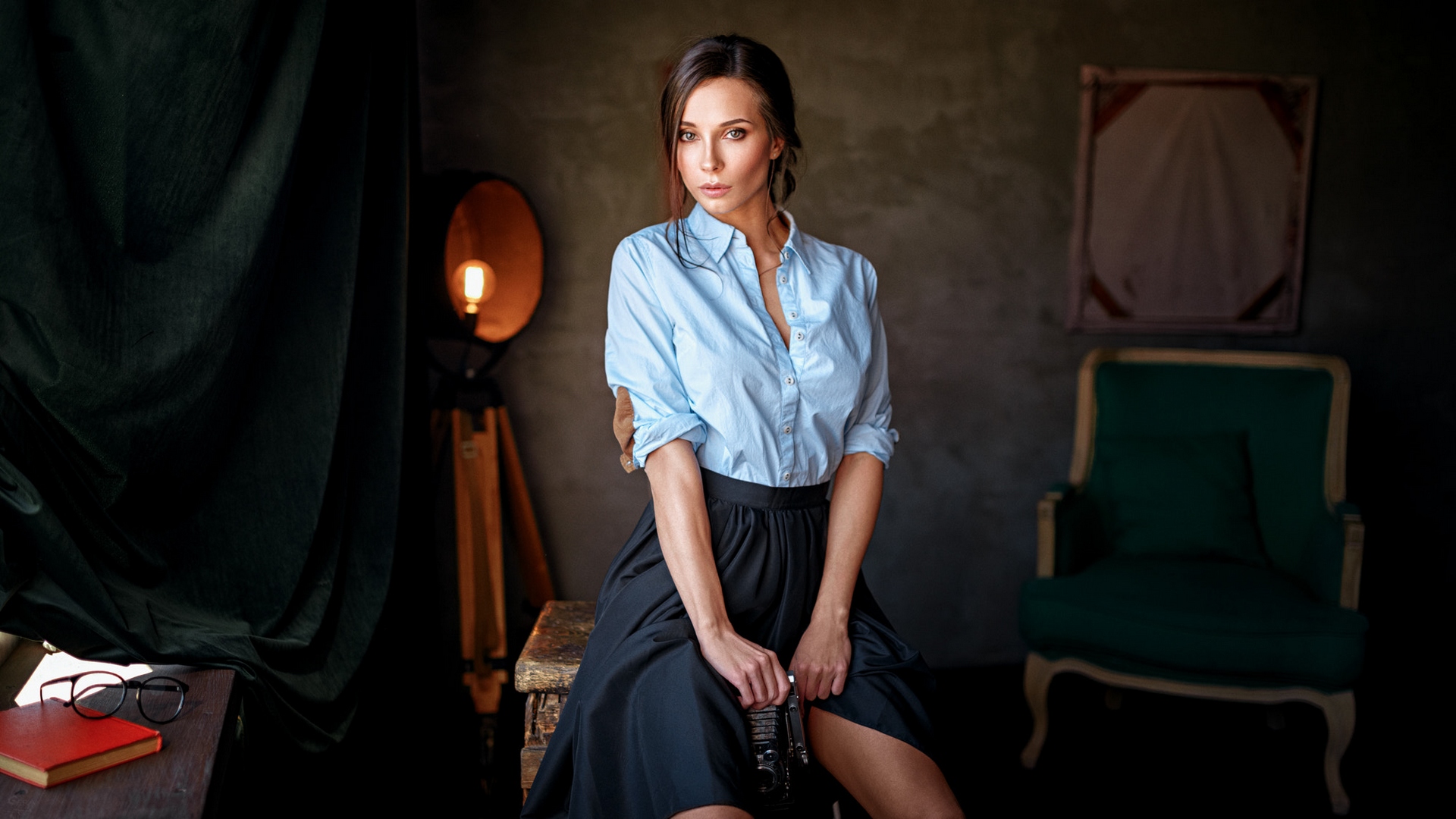 Description: A woman in a blue shirt and black skirt sitting on a chair in a room with a green chair.