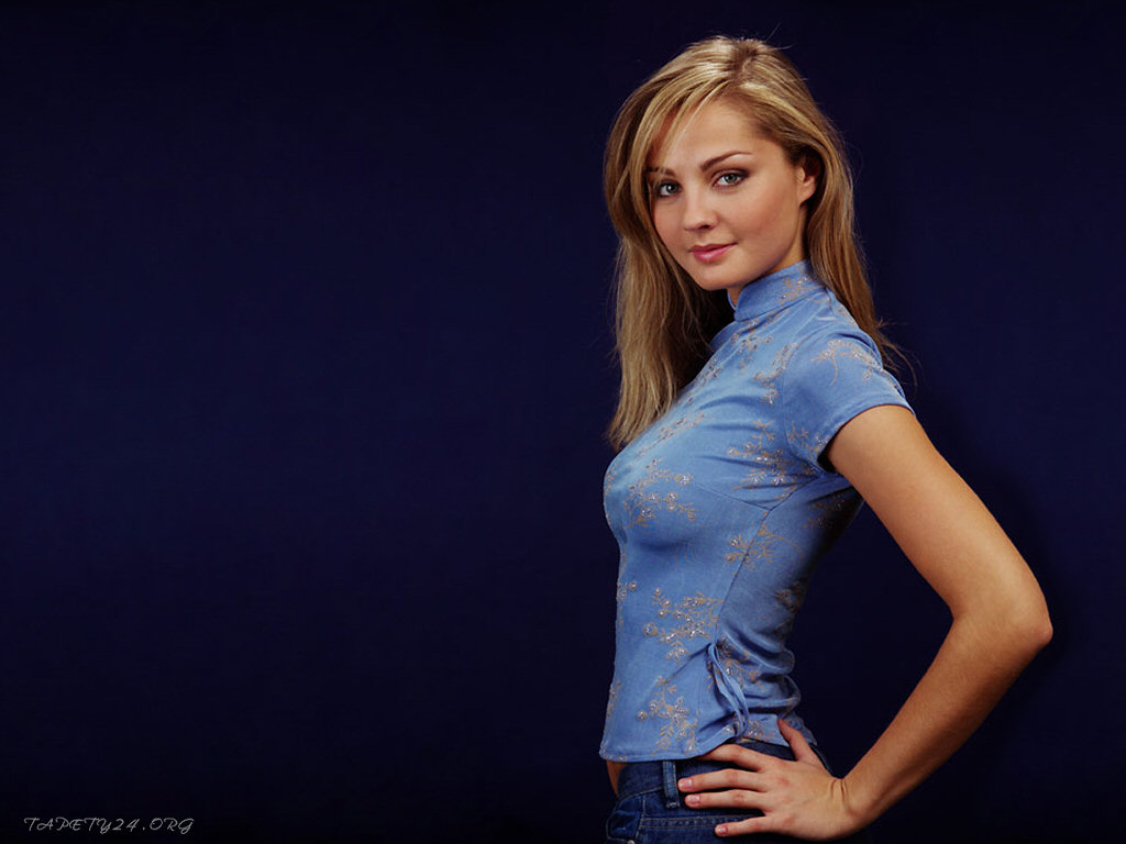 Description: A woman posing for a picture in a blue shirt and jeans with her hands on her hips and her hands on her hips.