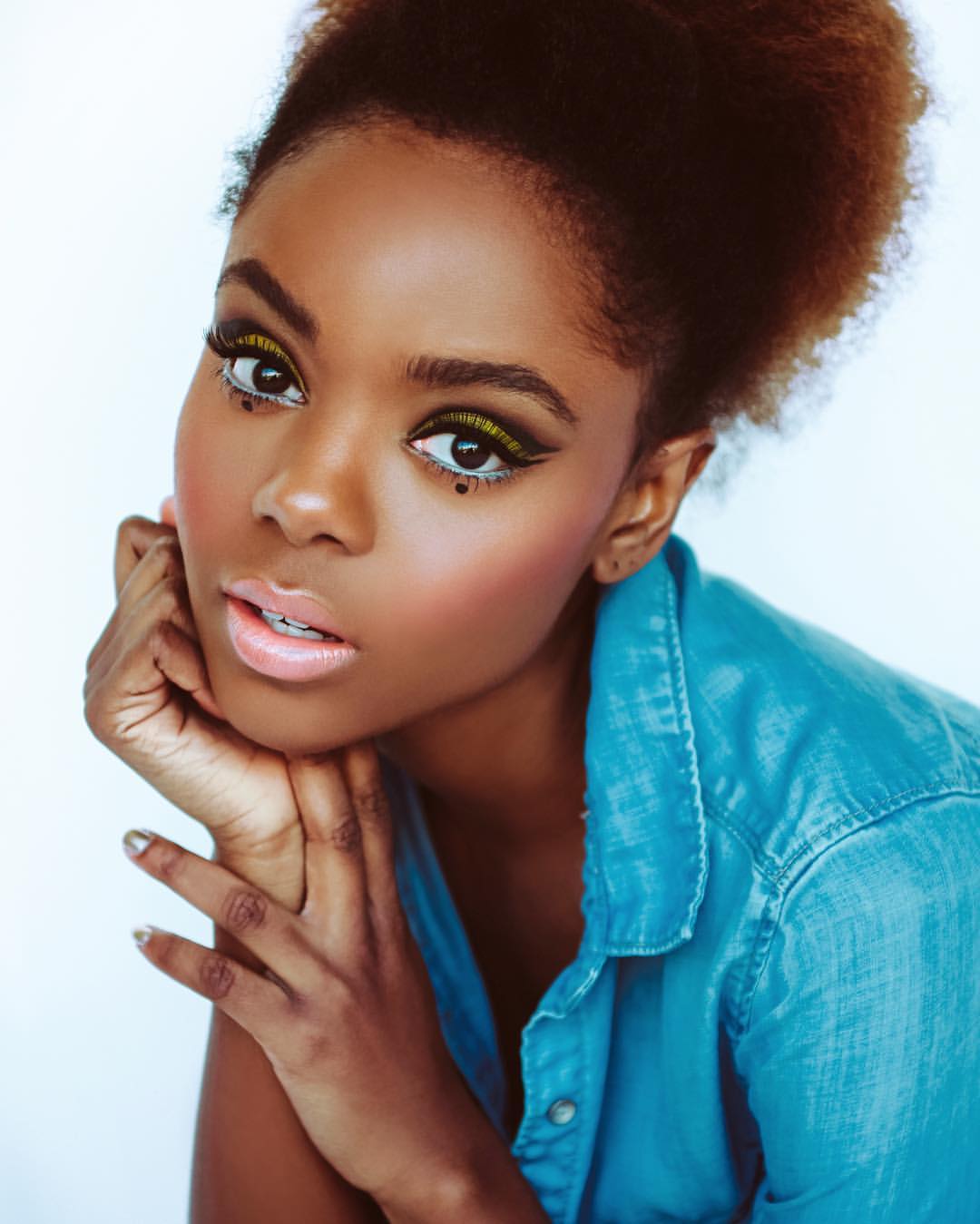 Description: A woman with a blue shirt and a blue shirt on posing for a picture with her hands on her chin.