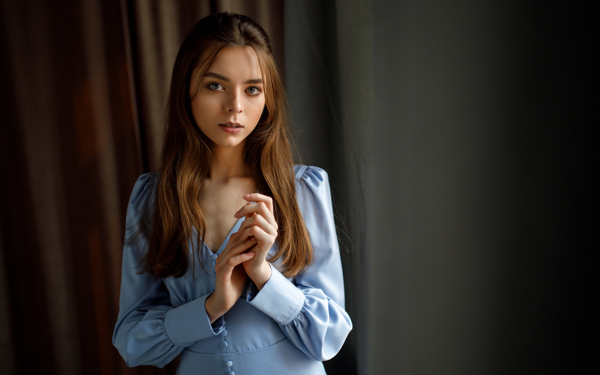 Description: A woman in a blue shirt is holding her hands together and looking at the camera with a serious look on her face.
