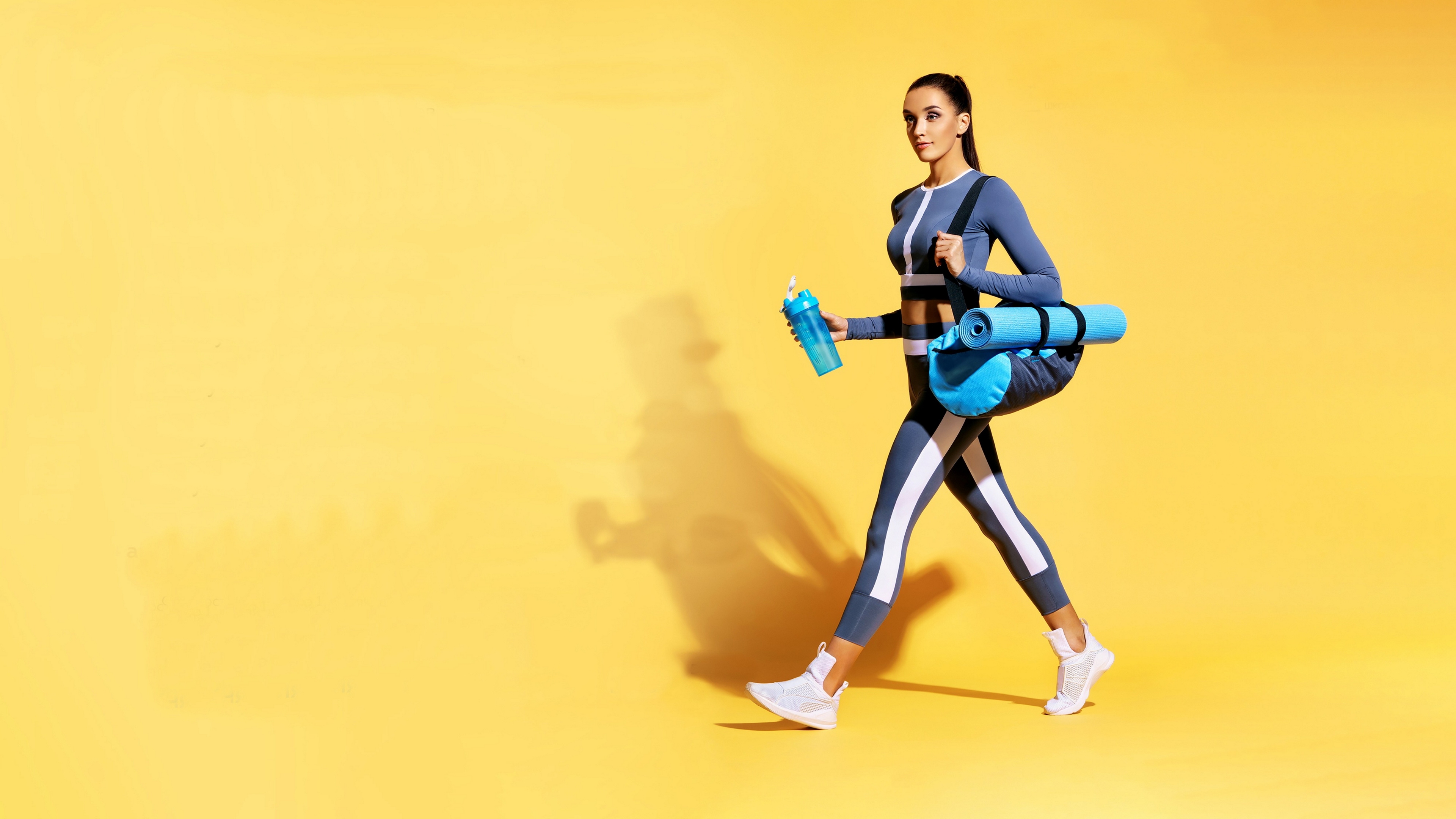 Description: A woman in a blue sports suit is holding a blue object in her hands and a yellow background is behind her.