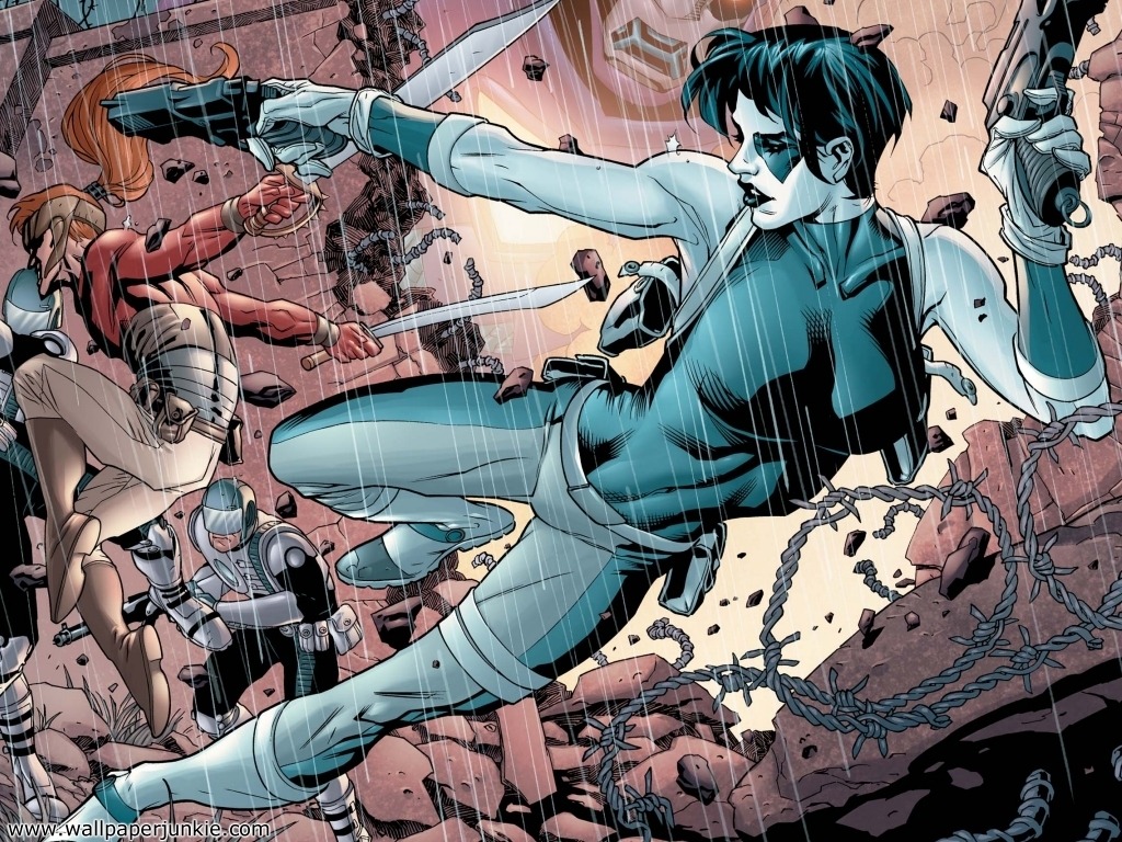 Description: A woman in a blue suit is surrounded by other women in a scene from the comics.