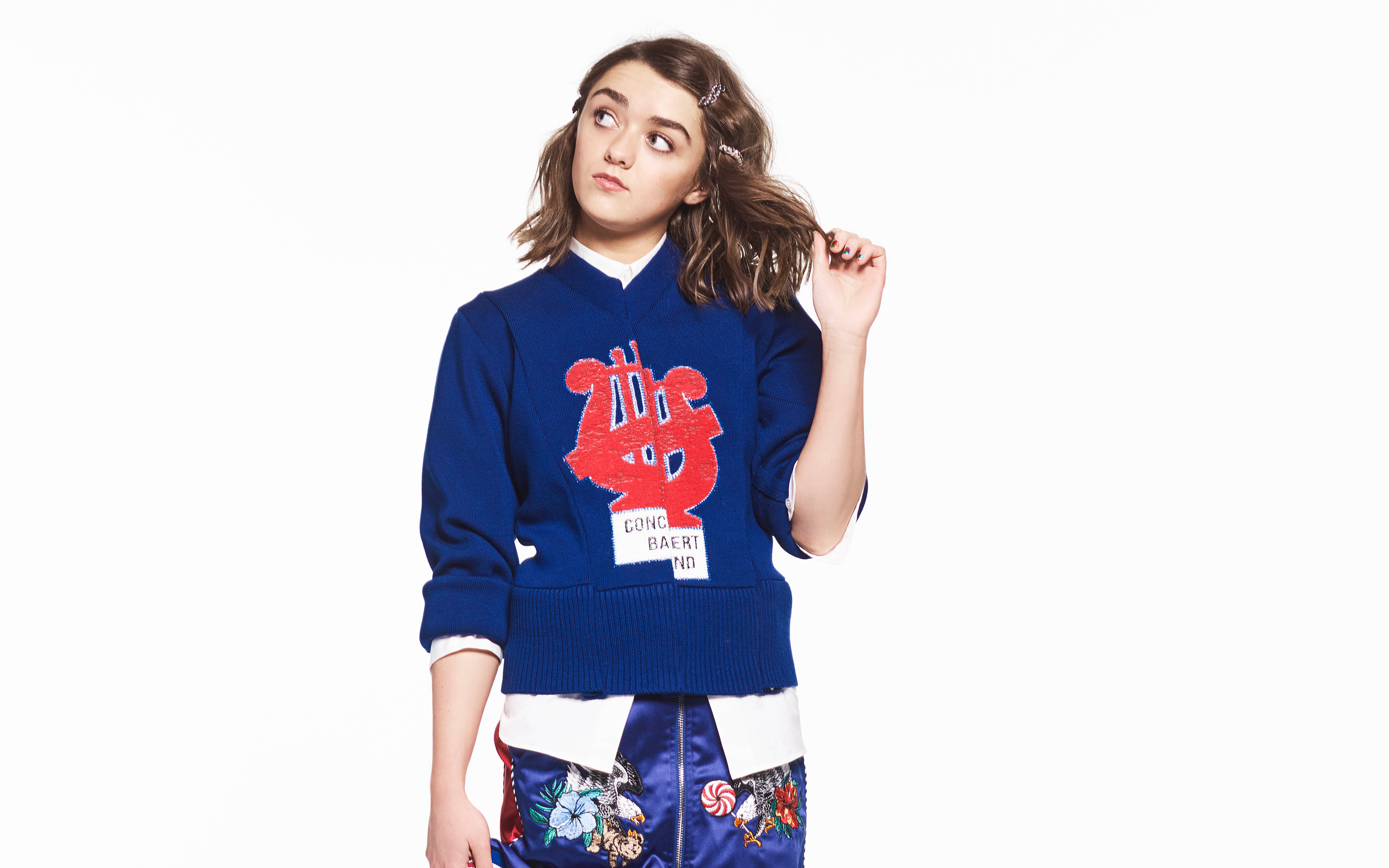 Description: A woman in a blue sweater and shorts posing for a picture with a skateboard in her hand and a skateboard in her other hand.